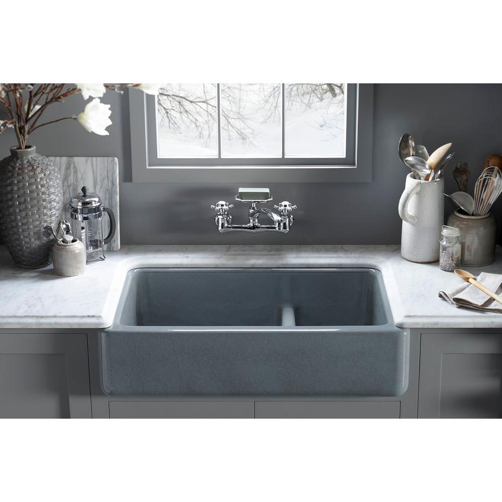The Whitehaven apron-front kitchen sink features a streamlined and versatile farmhouse style to complement any decor. Perfect for remodeling projects, it has a shortened apron that allows for installation on most new or existing 36 in. standard cabinetry. The Self-Trimming design requires only a simple rough cut, overlapping the cabinet face for beautiful results and easy installation. A low barrier divides the two compartments, making it easy to wash and rinse large items while still keeping the two basins separate. Crafted from enameled cast-iron, this sink resists scratching, burning and staining for years of beauty and reliable performance.