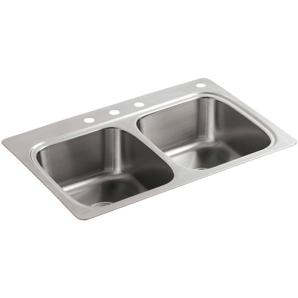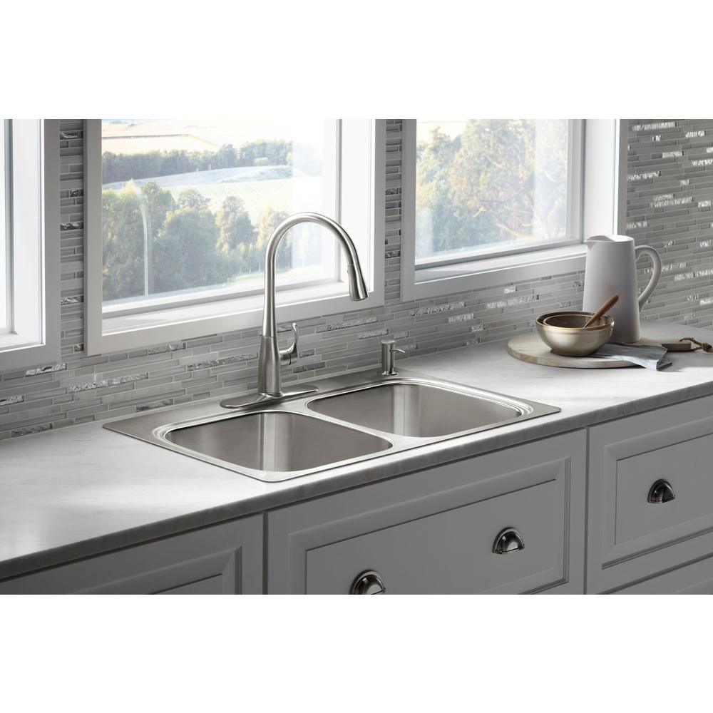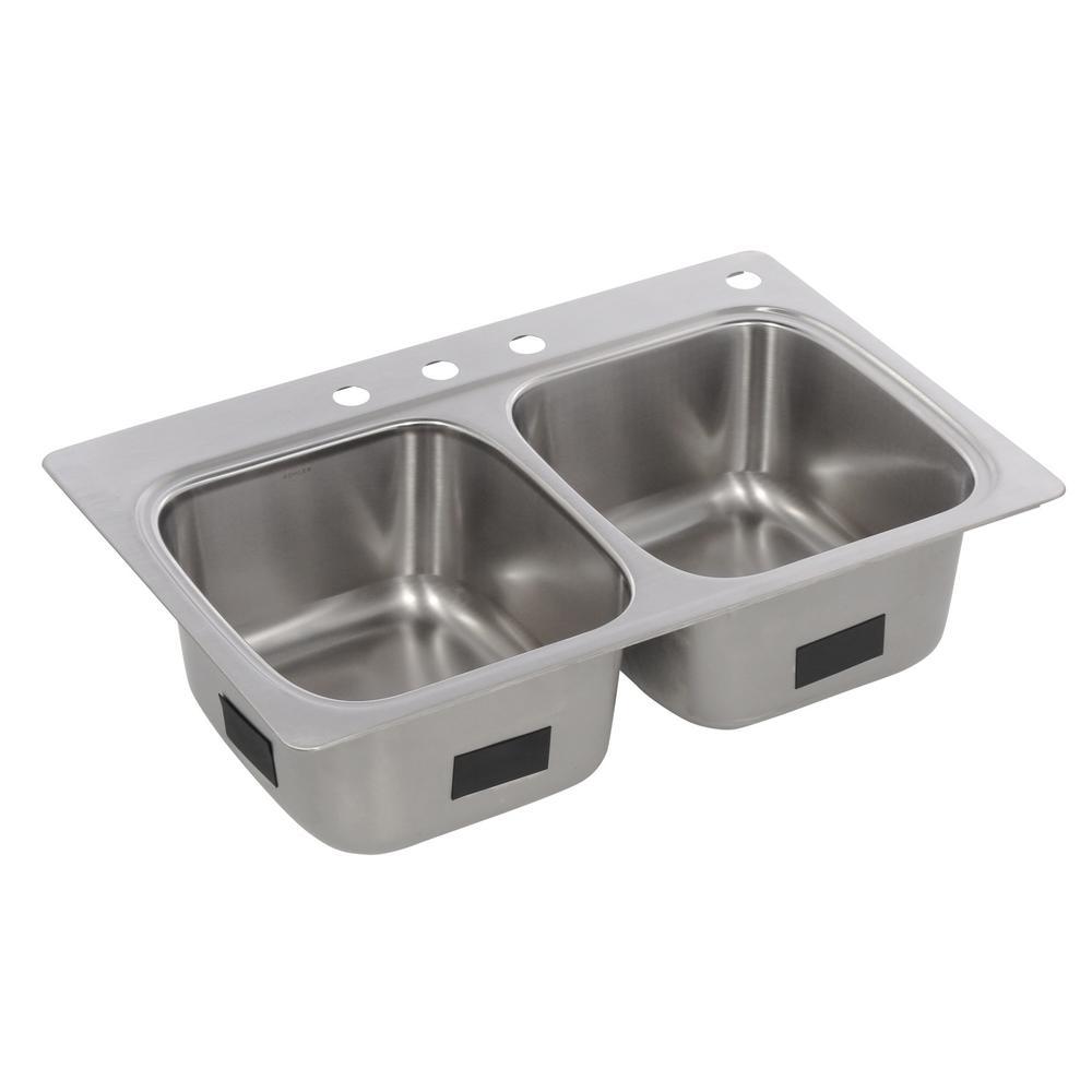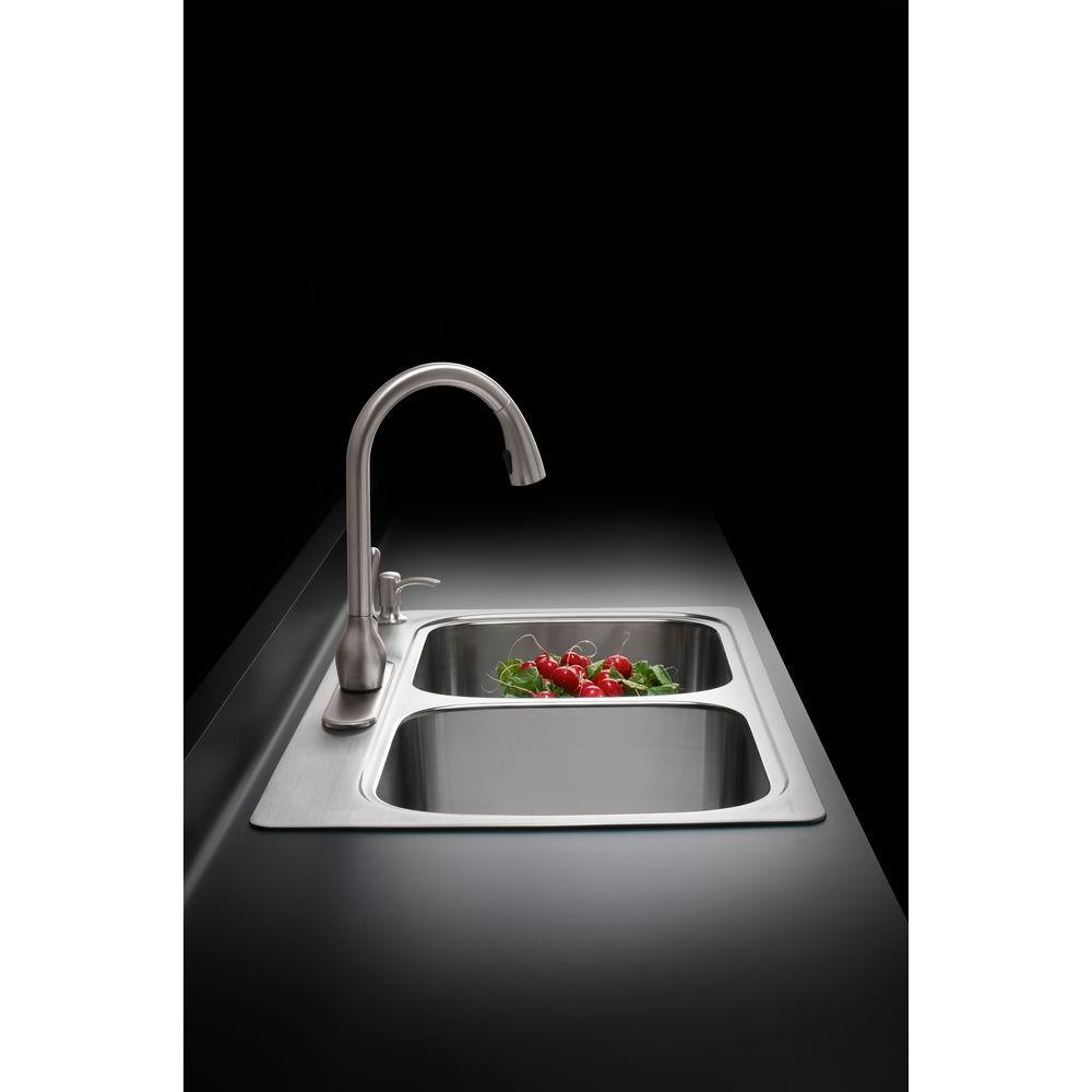 Blending with a wide variety of kitchen styles, this Verse double-basin sink features stainless-steel construction and a low-profile rim that simplifies cleanup, allowing you to sweep crumbs and liquid into the sink and out of sight. The engineered sound-absorption system significantly reduces disposal and dishwashing noise. It comes with a lifetime limited warranty.