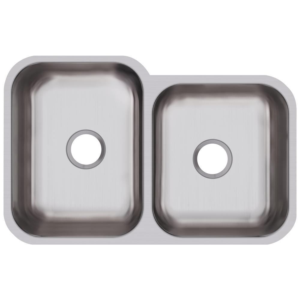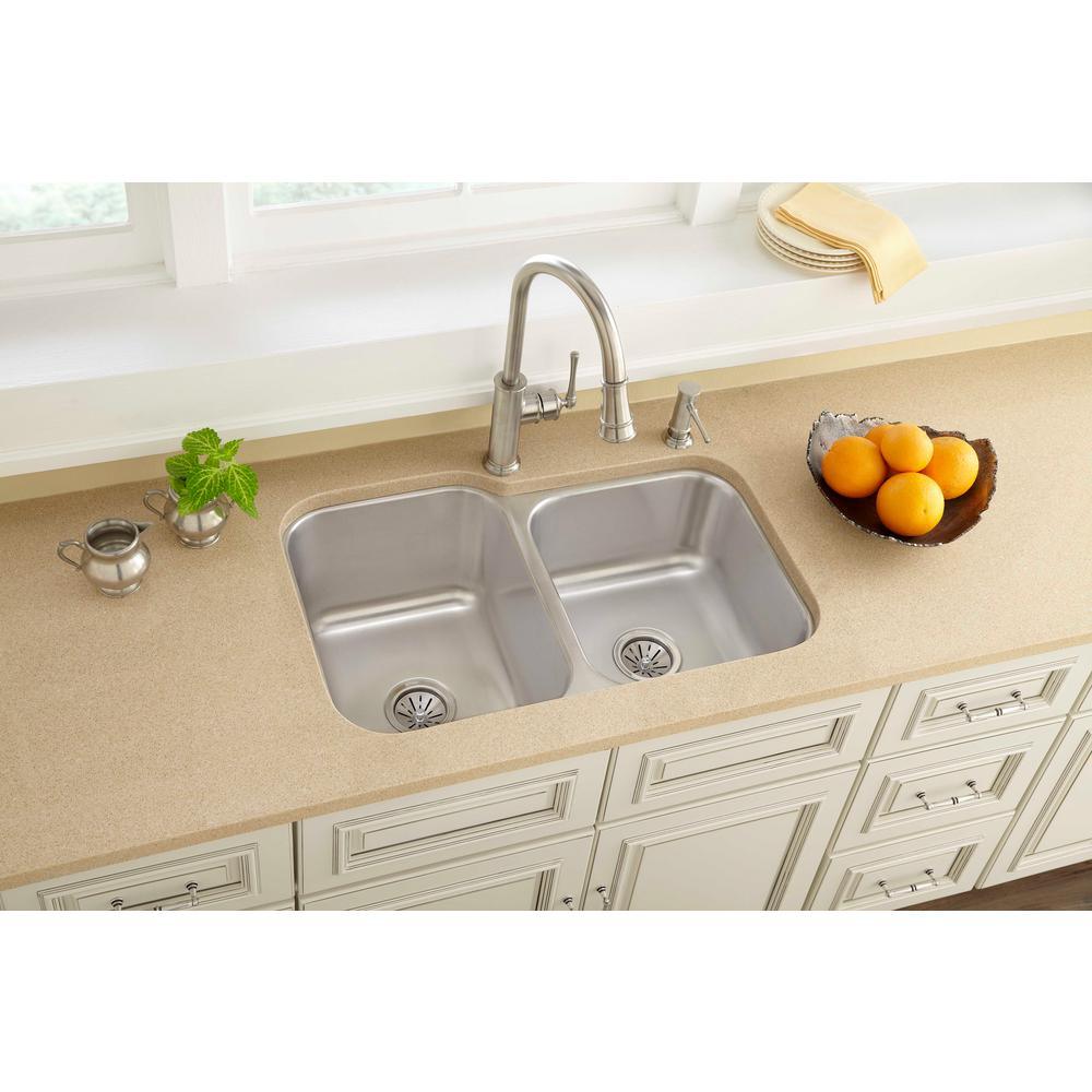 This Elkay Undermount 31-1/4 in. x 20-1/2 in. Double Bowl Kitchen Sink forms a perfect complement to most styles with an understated installation design. Generous basins provide plenty of working room, allowing for a dish strainer, colander or extra washing space as desired to make the most of your workspace. The sink has side and bottom pads to reduce the noise from dishes and running water.