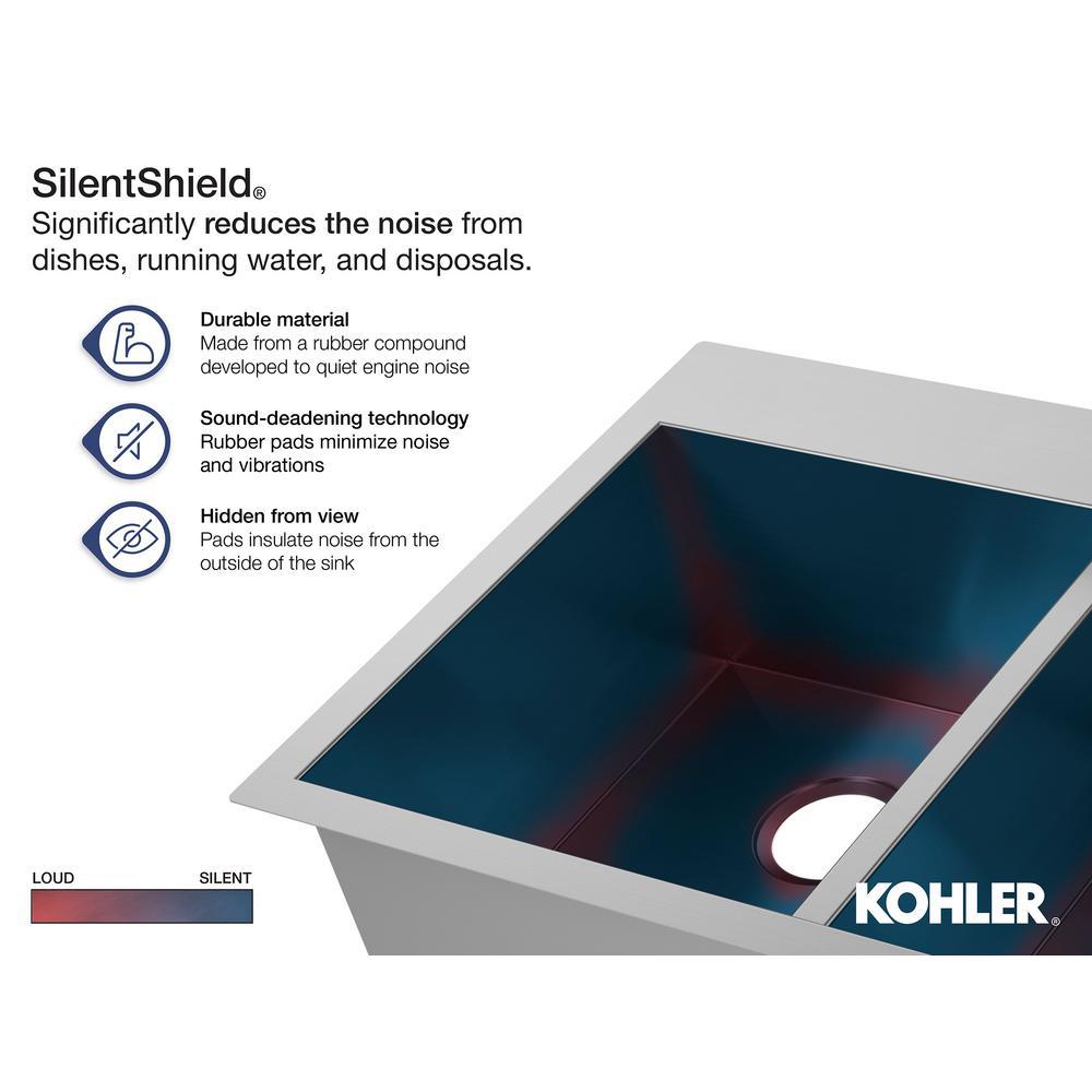Crafted from premium 18-Gauge stainless steel, the Ballad kitchen sink offers 2 generously sized basins, so you've got plenty of room for food prep and cleanup tasks. An engineered sound-absorption system significantly reduces disposal and dishwashing noise for a quieter kitchen environment. It comes with a lifetime limited warranty.