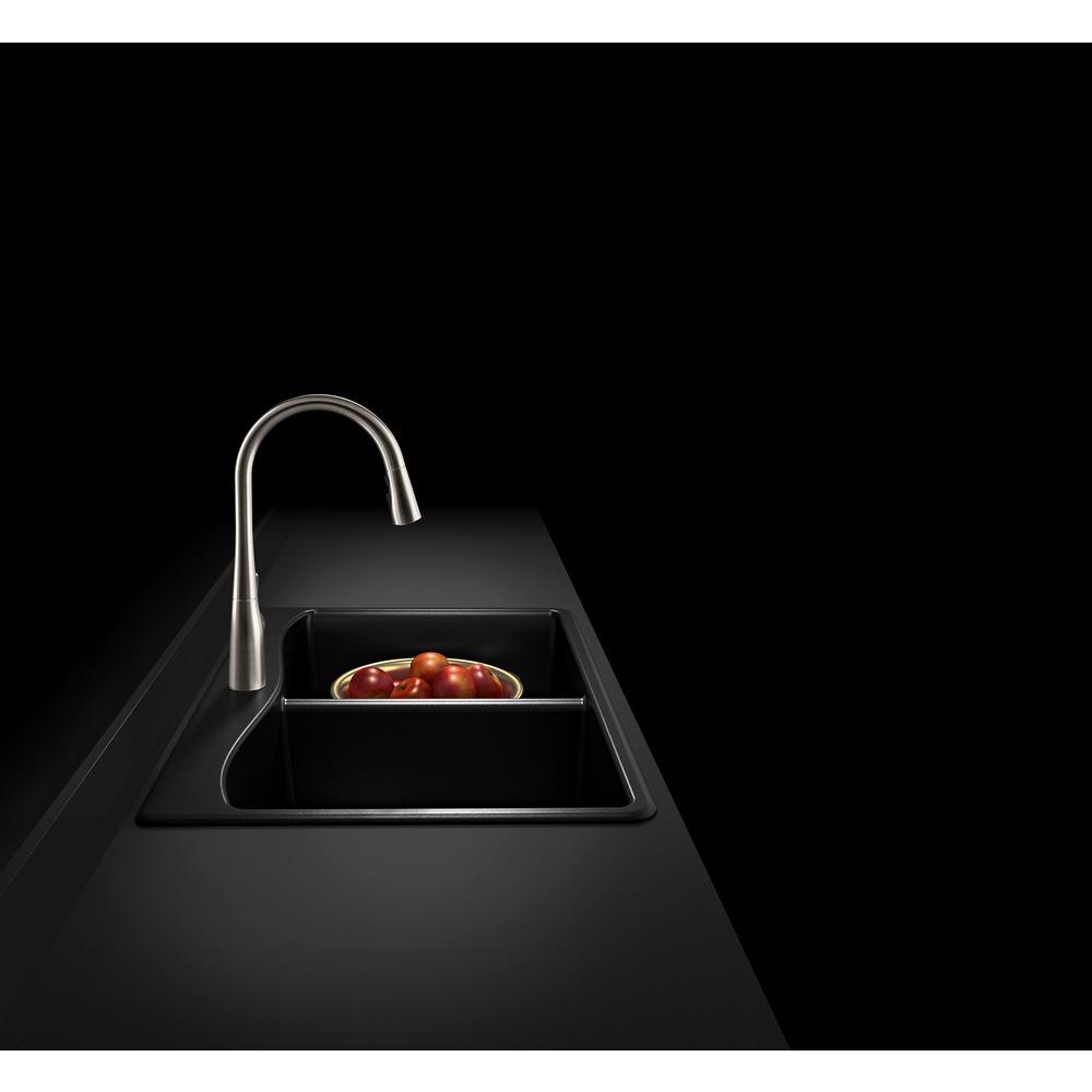 The Kennon double-bowl sink features an elegant, wave-like curve that complements any kitchen decor. The Kennon sink is made of KOHLER Neoroc, a matte-finish composite material designed for extreme durability and unmatched beauty. Richly colored to complement any countertop, Neoroc resists scratches, stains, and fading and is highly heat- and impact-resistant.