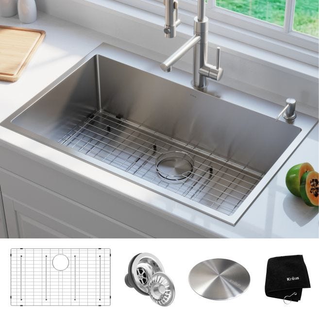 | Included Accessories | Bottom grid, drain assembly with removable strainer, decorative drain cover, kitchen towel |