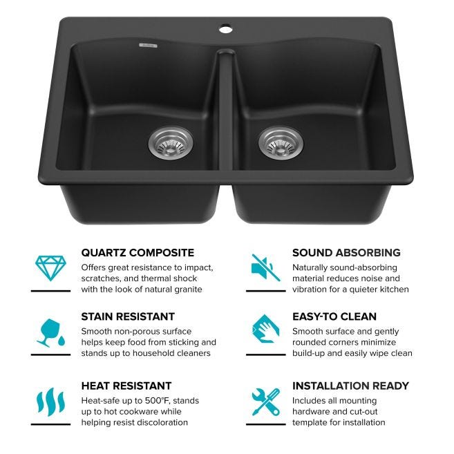 Durable quartz composite sink with dual-mount flexibility fits 36-inch cabinets and features a 50/50 double bowl layout. Smooth, non-porous surface resists stains, scratches, and heat up to 500°F, with gently rounded corners for easy cleaning. Includes drain assemblies, silicone mitt, trivet, mounting hardware, and cut-out template.