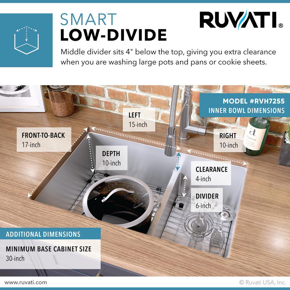 Ruvati takes kitchen functionality to a whole new level with this smartly designed low-divide double bowl sink. Now you can enjoy the same benefits of a single bowl sink with the divided functionality of a double bowl sink. What's special? The center divider of the sink is 4 in. lower than the rim. The extra clearance is a blessing when you are washing those large pots and pans, or cookie sheets. Homeowners and Interior Designers agree: if you are going with a double bowl sink, this low-divide sink from Ruvati is the smartest choice for your kitchen.