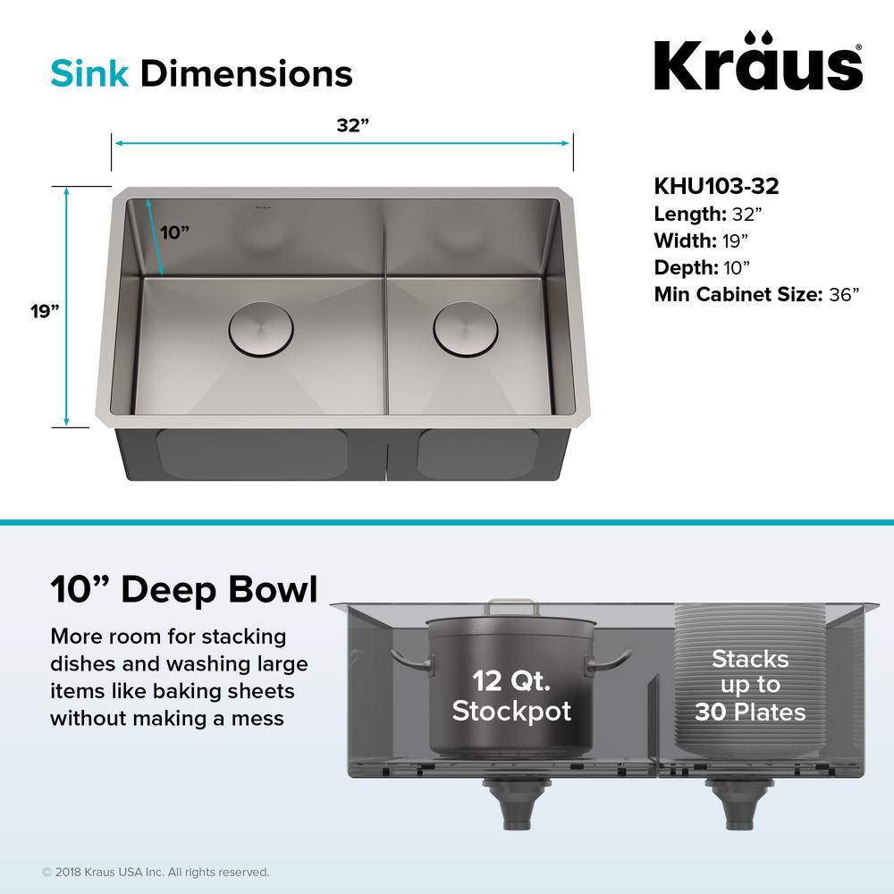 • Outer sink dimension: 32 in. L x 19 in. W x 10 in. D, minimum cabinet size: 36 in.
