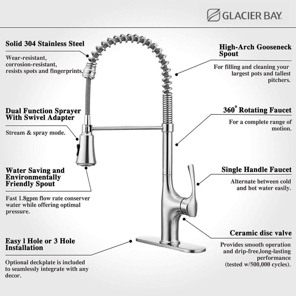 • Includes solid 304 stainless steel and lead-free pull-down kitchen faucet, 360° rotation spout, 90° rotation single handle operation, dual-function spray head