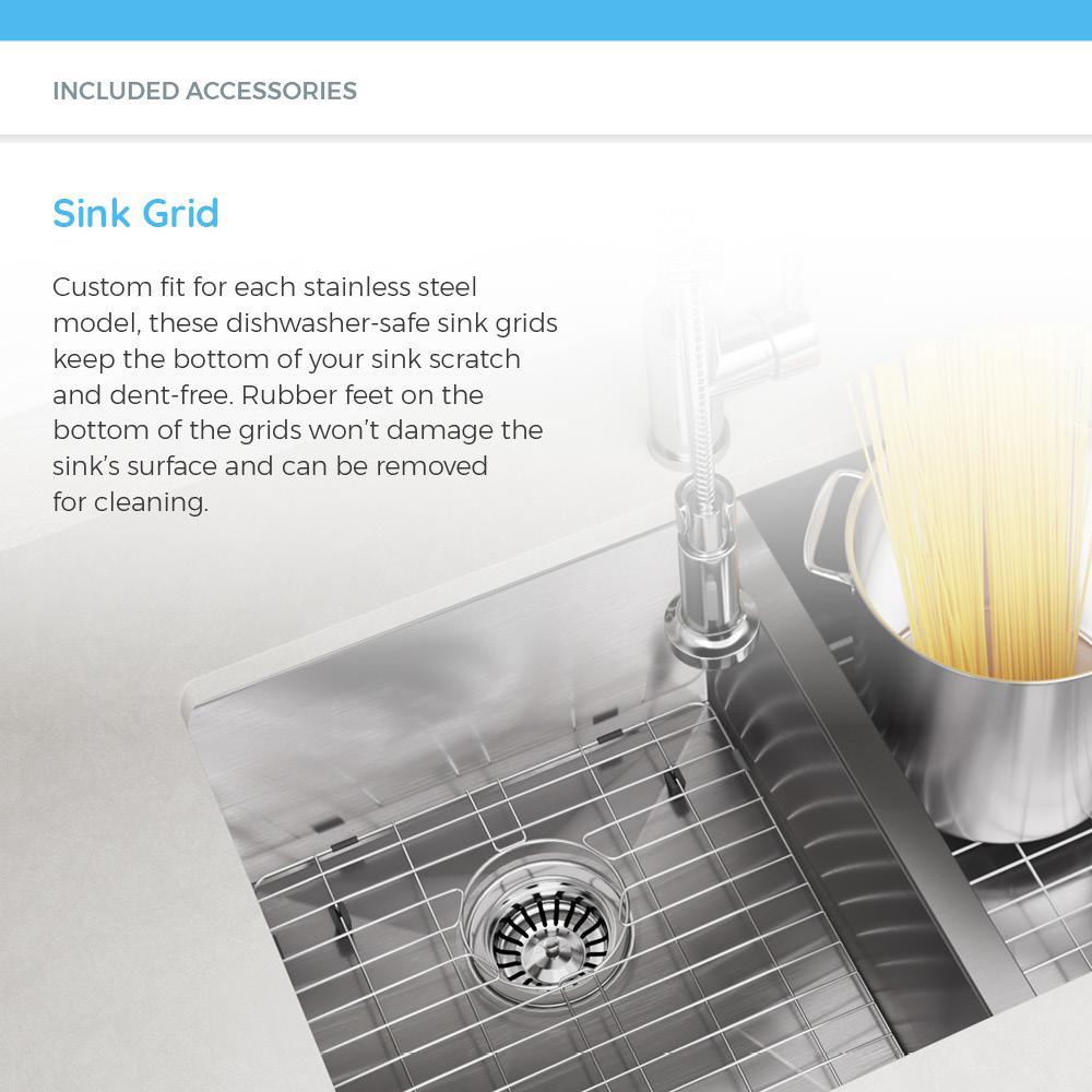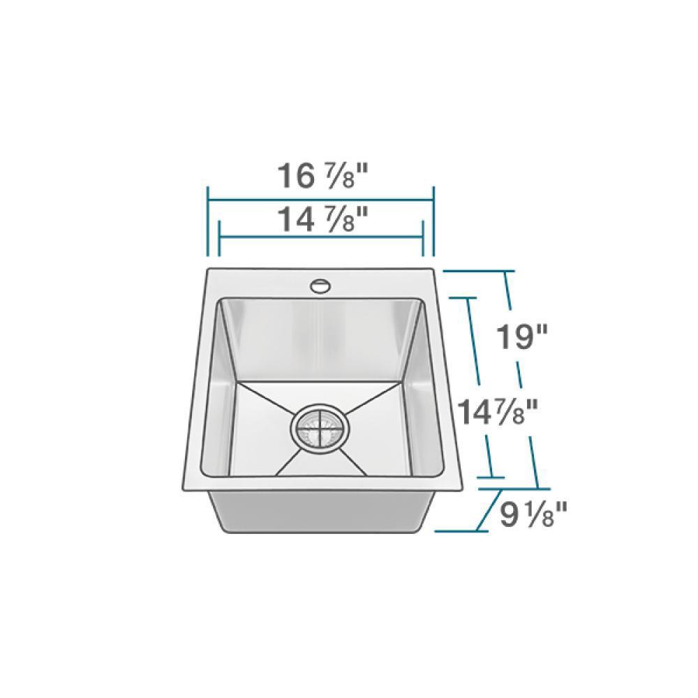 Created as a bar or food prep sink, this single-bowl design provides plenty of space for either use. It is mounted above the counter which will flaunt its 3/4 in., corner radius style. Although small overall, its tight corners, square shape, and ample depth make it a wise choice. The T1717 is 304-grade, cold rolled steel, at the industry standard 18-Gauge thickness. The surface is given a brushed-satin finish which adds to its luster and masks minor scratches which could occur over time. Dense, sound-dampening pads and an insulation coating are applied to the underside. With an overall measurement of 16-7/8 in. x 19 in. x 9-1/8 in., it will require a minimum-width cabinet of 18 in. It is cUPC certified. Our high-quality stainless steel grid is custom-made to fit this basin. It helps protect the surface from scratches and dents, and prevents water from contaminating food. Its removable rubber feet raise it slightly above the bottom of the sink. Our basket strainer offers a deep, perforated, metal basket, complete with handle. It sits inside the main body and holds considerably more waste than standard models.