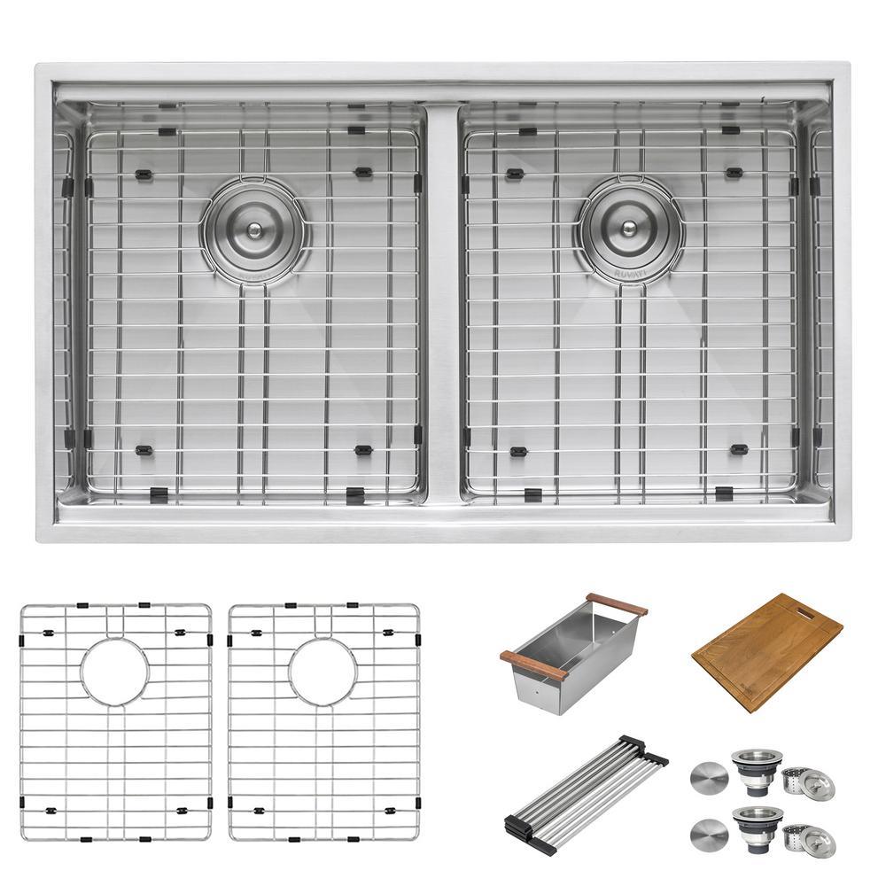 • Included in box: Sink, stainless steel colander, wood cutting board, foldable dish drying rack, bottom rinse grids (set of 2), 2 basket strainer drain assemblies, decorative drain cover, cut-out template and mounting brackets