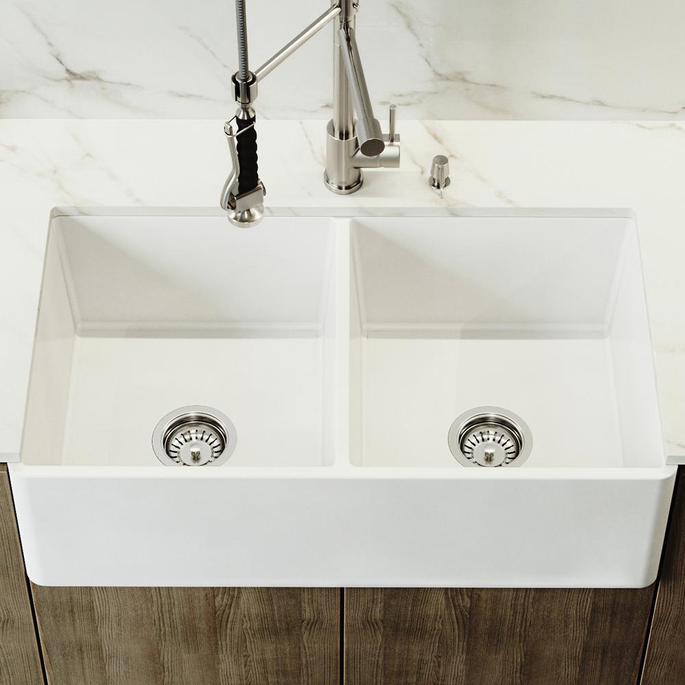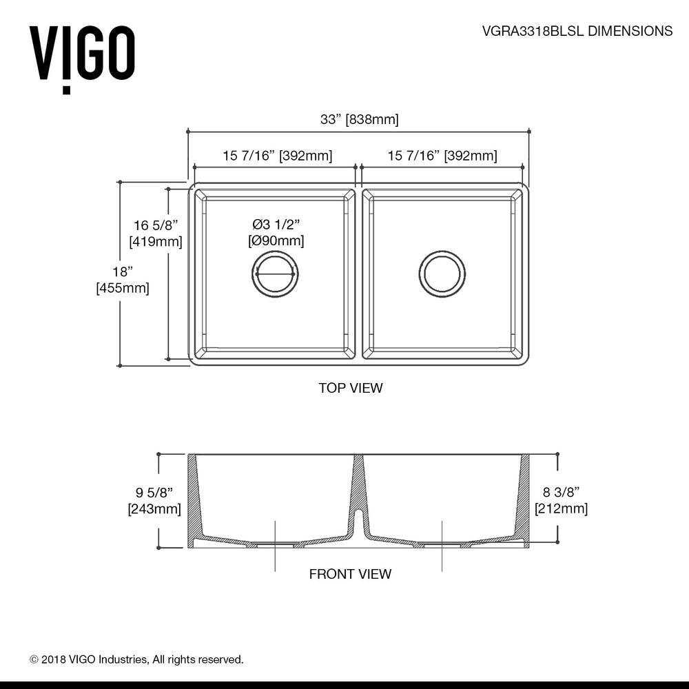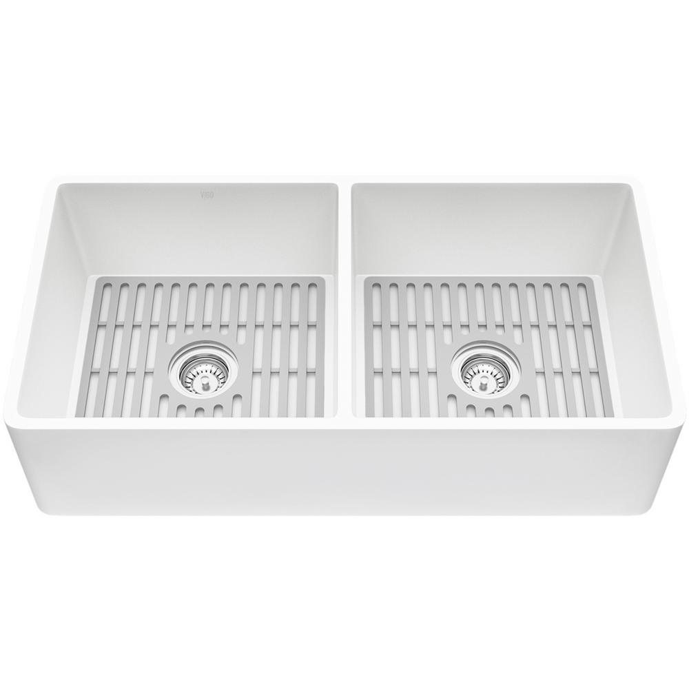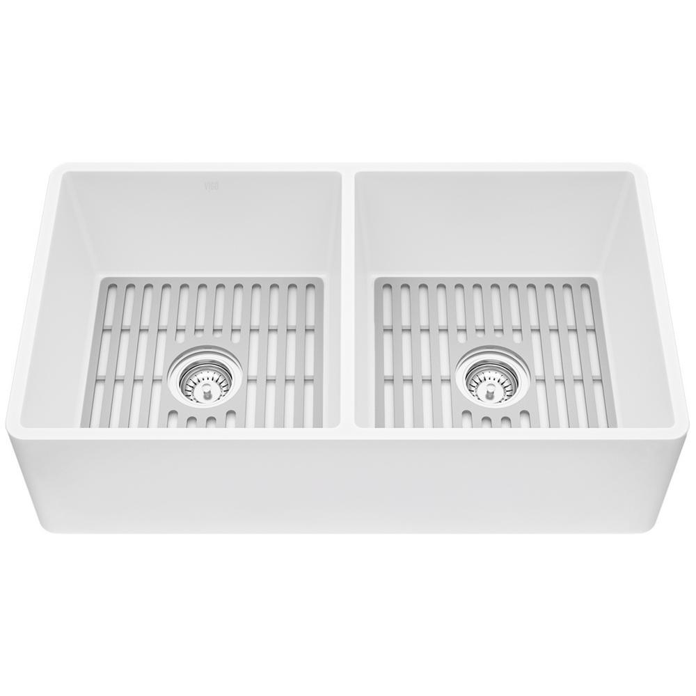 Functional excellence has never been easier than with the VIGO 33 in. Matte StoneTM Double Bowl Farmhouse Apron Front Kitchen Sink. Built from VIGO's proprietary Matte StoneTM, a solid, seamless, and non-porous composite, this sink is an updated interpretation of the classic farmhouse kitchen sink. With exceptional durability and a 50/50 double bowl split for optimal use and efficiency, having it all has never been more accessible. The set includes 2 sink drain strainers and an embossed VIGO cutting board.