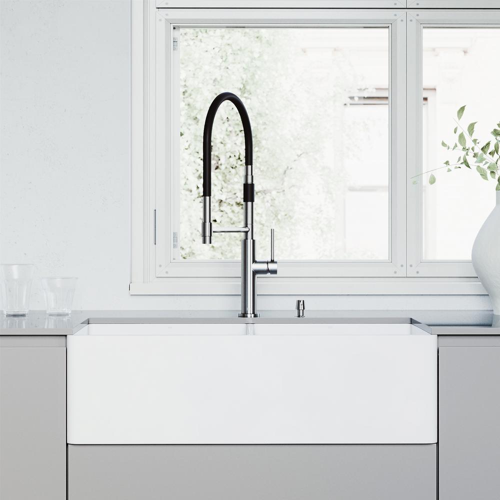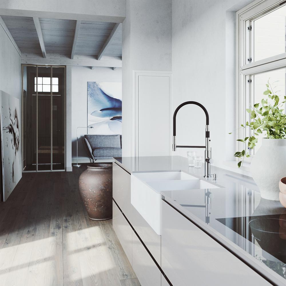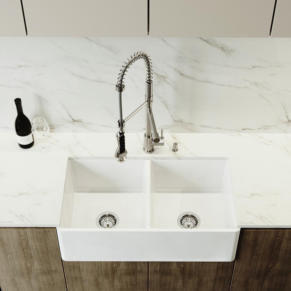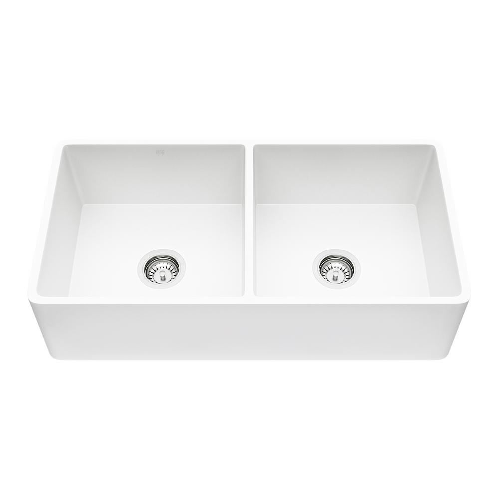 Functional excellence has never been easier than with the VIGO 33 in. Matte StoneTM Double Bowl Farmhouse Apron Front Kitchen Sink. Built from VIGO's proprietary Matte StoneTM, a solid, seamless, and non-porous composite, this sink is an updated interpretation of the classic farmhouse kitchen sink. With exceptional durability and a 50/50 double bowl split for optimal use and efficiency, having it all has never been more accessible. The set includes 2 sink drain strainers and an embossed VIGO cutting board.