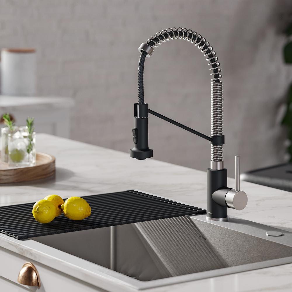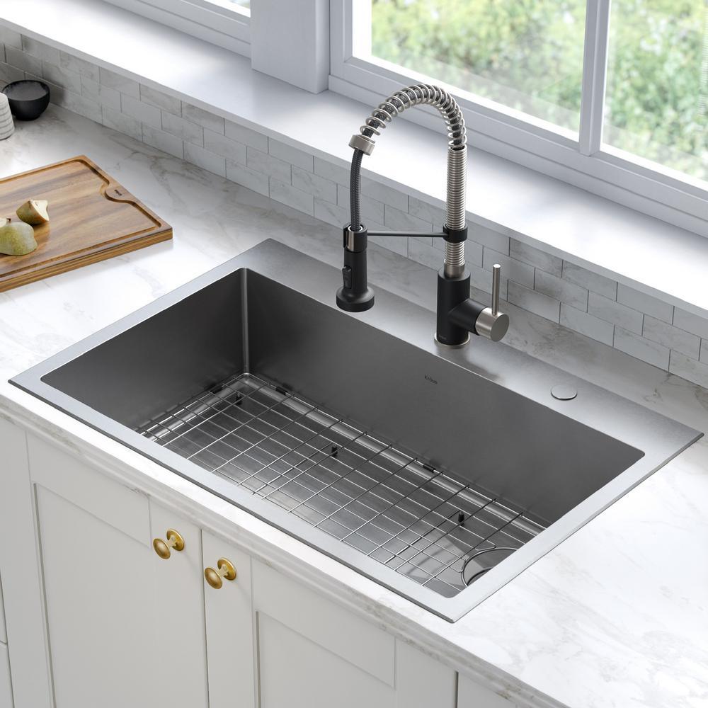 Designed with a right off-set drain, straight walls, and tight-radius corners, the Loften high-capacity stainless steel sink will add a contemporary feel to your kitchen. Convenient dual mount configuration allows you to install it as an undermount or top mount with any type of kitchen counter. Handcrafted from high quality T304 stainless steel with gently sloped bottom and creased channel grooves that allow for superior drainage. Comes paired with a commercial style pull-down faucet with 16 in. reach for a cohesive look and optimum efficiency