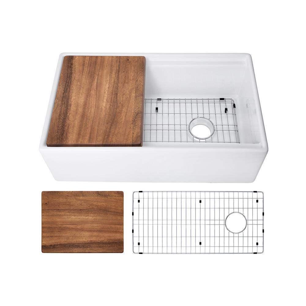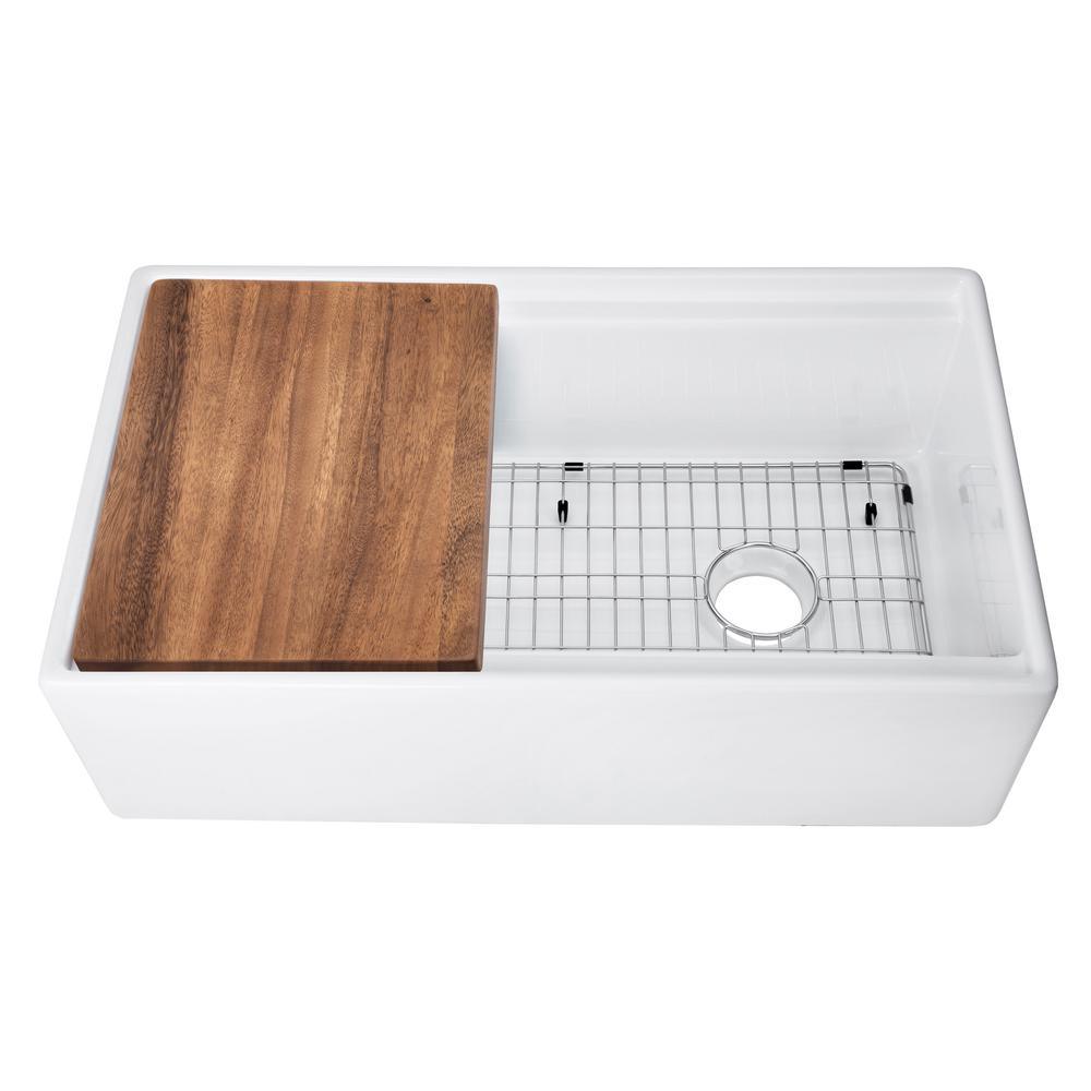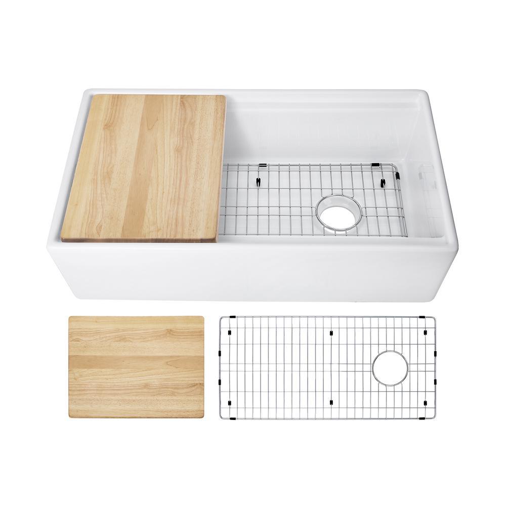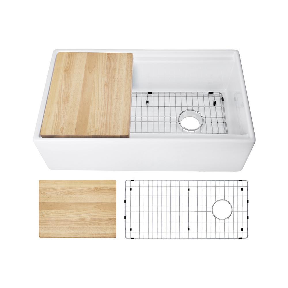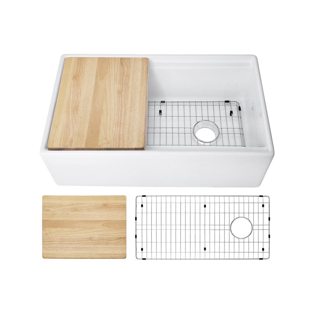 Fireclay 33 in. Single Bowl Farmhouse Apron Front Reversible Kitchen Sink in White with Cutting Board and Grid