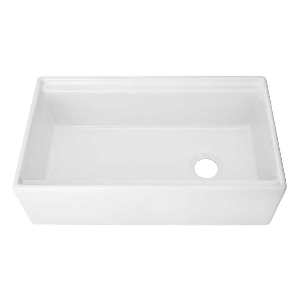 Enduring in beauty and performance, this apron front kitchen sink is a fashionable kitchen fixture with modern farmhouse charm. The white sink is sculpted from fireclay and exposed to extreme temperatures, developing a smooth enamel finish that's strong, stain resistant and stands up to everyday use. An inset ledge within the sink basin provides a seamless shelf for a dark wood cutting board that's perfect for prep. The versatile undermount format can be installed as floating sink or flush beside kitchen cabinetry. Crafted by hand with exceptional care, subtle design details throughout the rectangular basin and apron front panel enhance the sink's artisanal appearance.