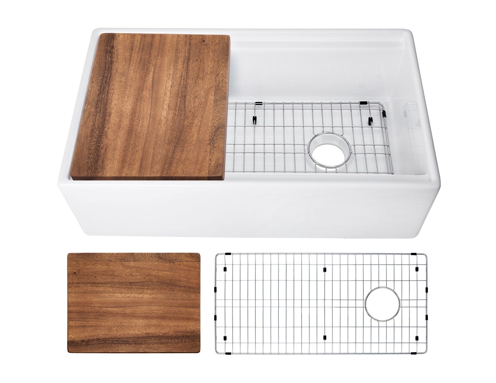 This 33-in farmhouse workstation sink is crafted from durable fireclay with a glossy white enamel that resists stains, scratches, and heat. The undermount apron-front design features an inset ledge to hold a dark walnut cutting board and includes a protective stainless steel grid for heavy-duty kitchen tasks.