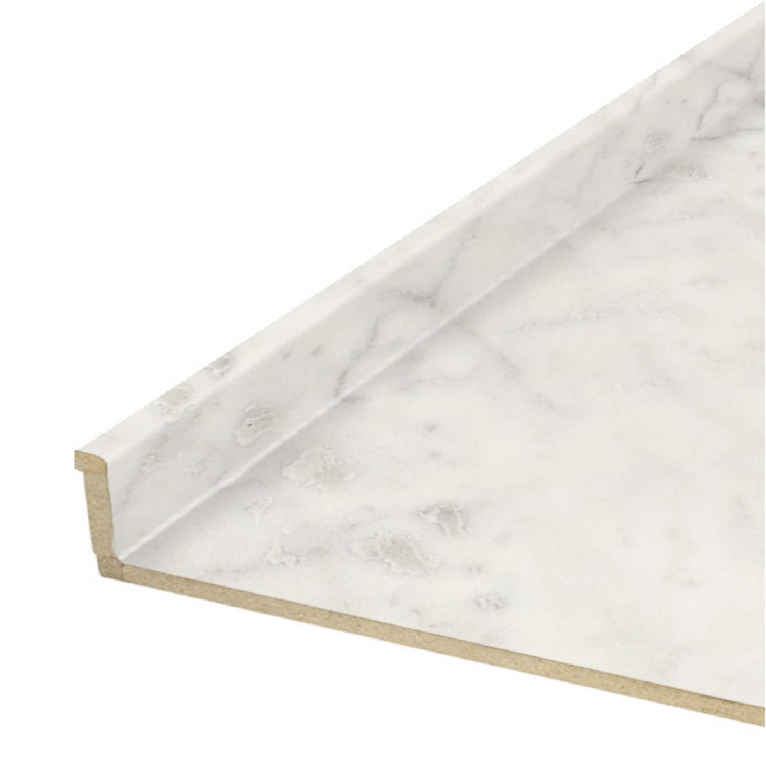 A durable, marble-look laminate countertop featuring the Formica Carrara Bianco pattern and an Ora full-wrap edge. This 10-ft right-hand miter cut top includes an integrated backsplash and is built for stain, scratch, and scuff resistance.