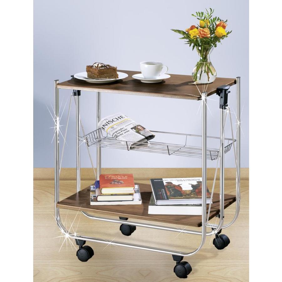 Ideal as a Side Table for the kitchen, living room bathroom or patio Robust metal frame with MDF plate in walnut look and four smoothly-running castors Two storage shelves and an additional mesh basket offer ample space for plates, cups, glasses, bowls, etc Easily foldable to save space Load capacity up to 88.18lb