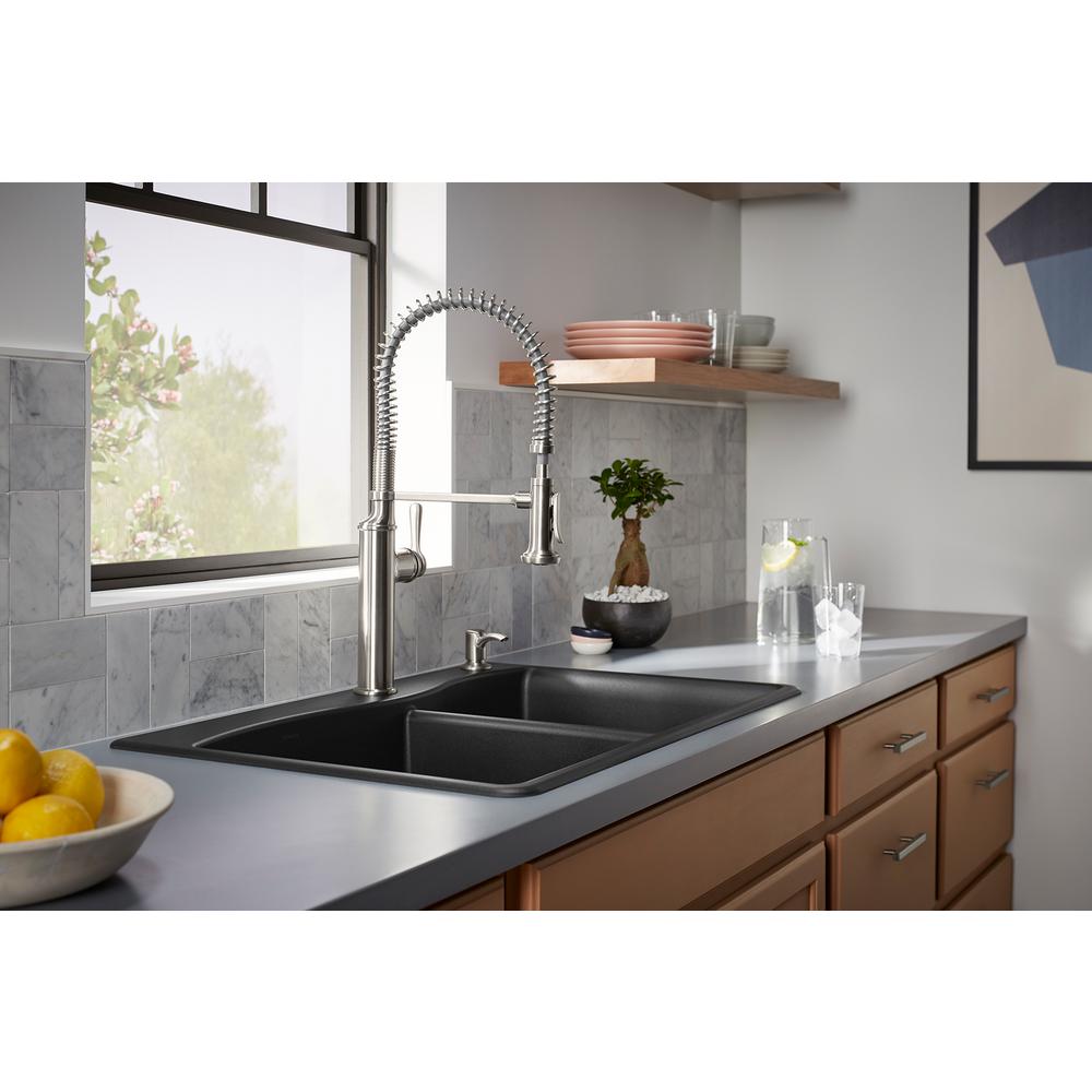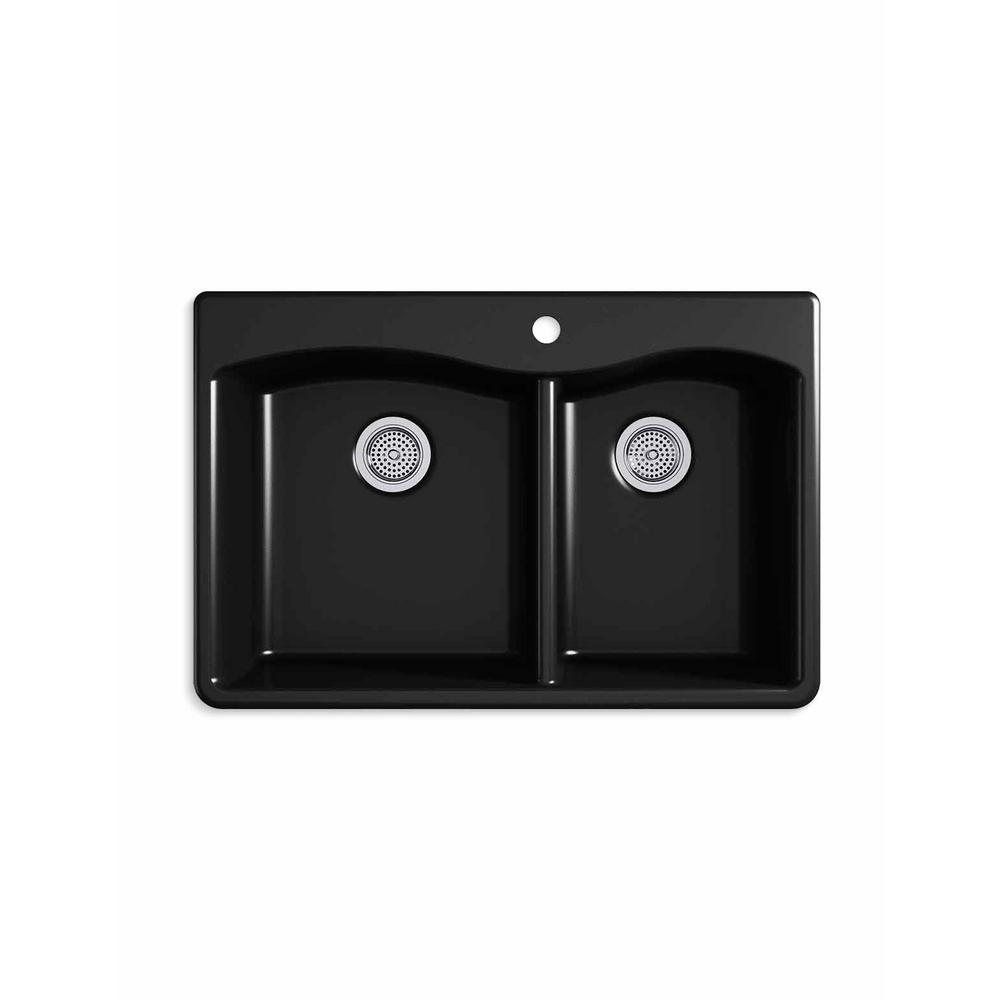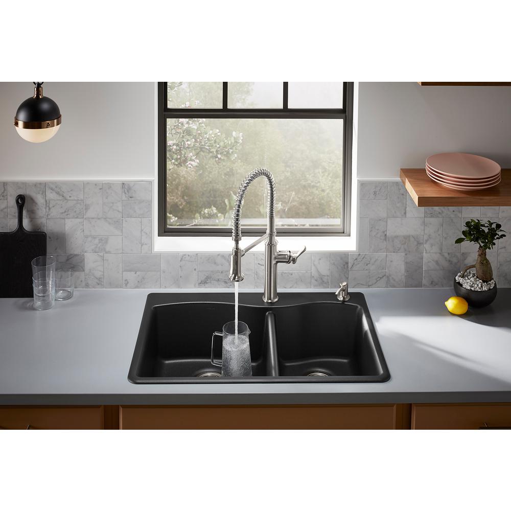 The Kennon double-bowl sink features an elegant, wave-like curve that complements any kitchen decor. The Kennon sink is made of KOHLER Neoroc, a matte-finish composite material designed for extreme durability and unmatched beauty. Richly colored to complement any countertop, Neoroc resists scratches, stains, and fading and is highly heat- and impact-resistant.