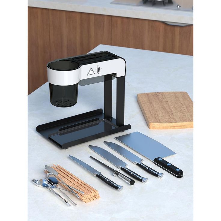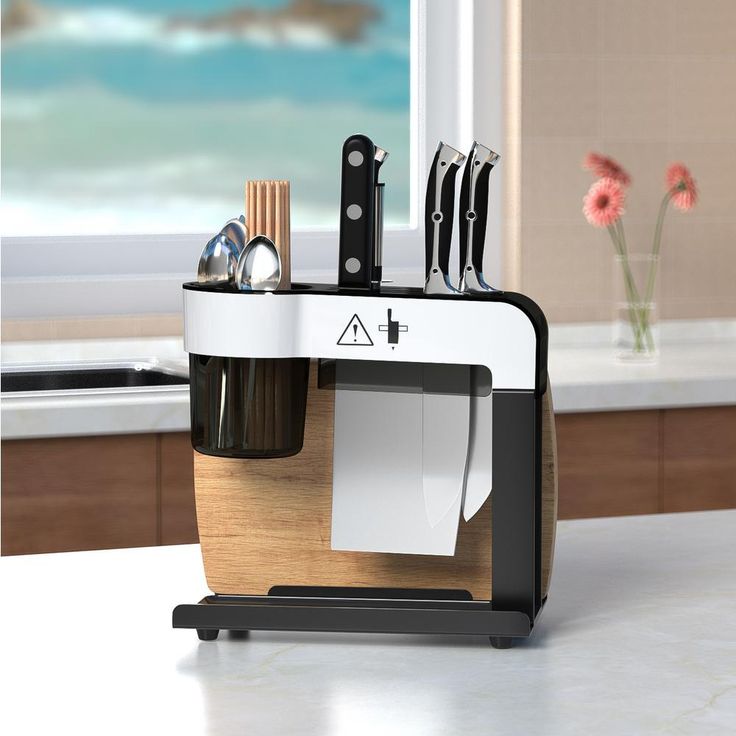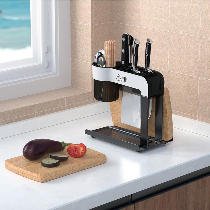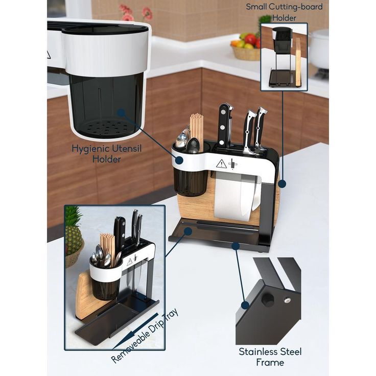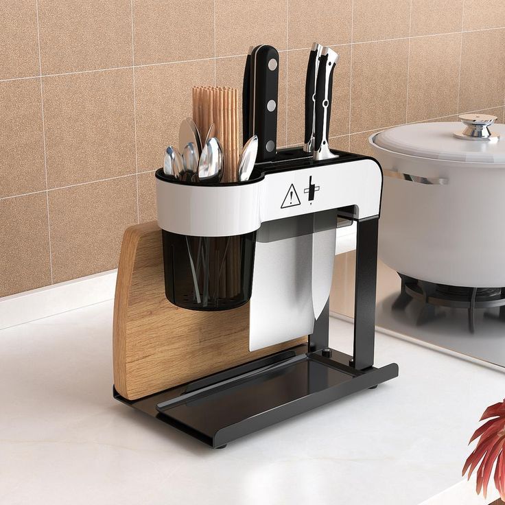 Black Stainless Steel Utensil and Cutlery Rack Kitchen Organizer Drip Tray Knife Storage Block with Cutting-board Holder