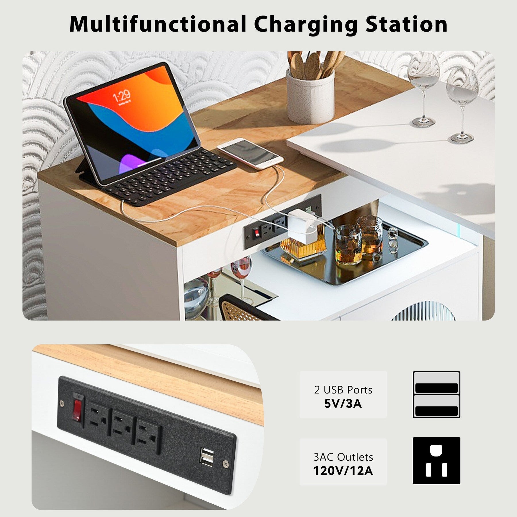 Bring creativity to your kitchen with the BABOOM White Rolling Kitchen Island, featuring a durable MDF base and a smooth rubberwood top. Equipped with versatile storage, USB ports, LED-lit fluted glass doors, and 360-degree wheels, this island is a functional and stylish addition to any cooking space.