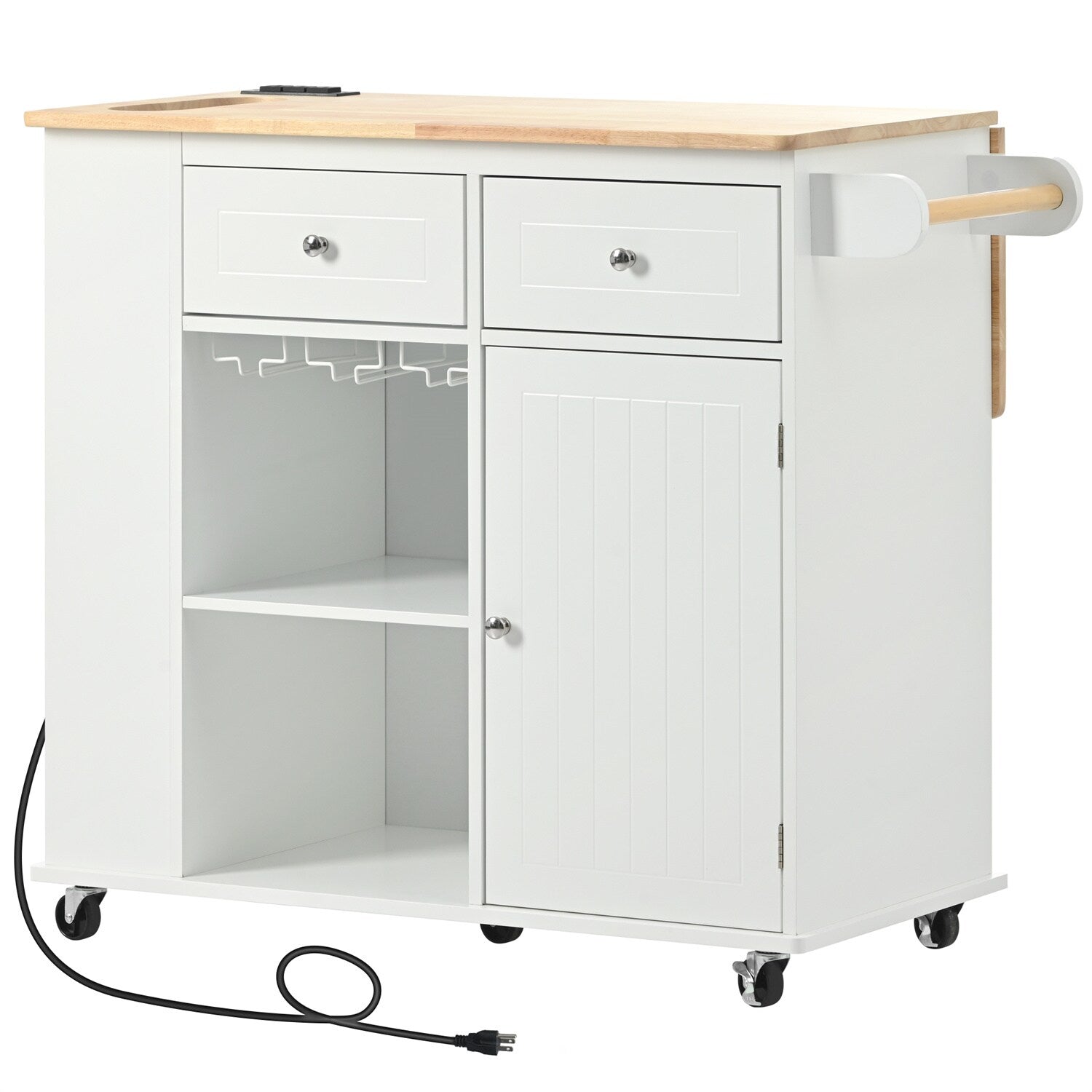 A: The island features a power outlet with a 78.7-inch cord, perfect for using kitchen appliances, and can be tidily stored in the side compartment when not in use.
