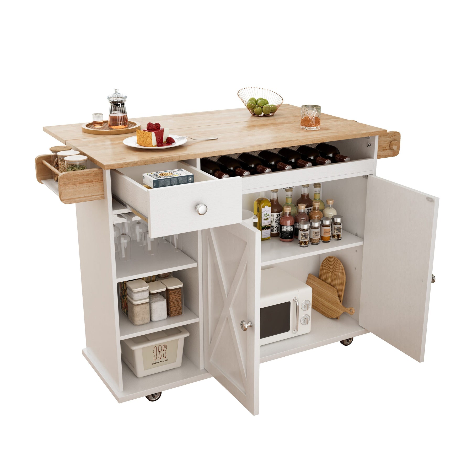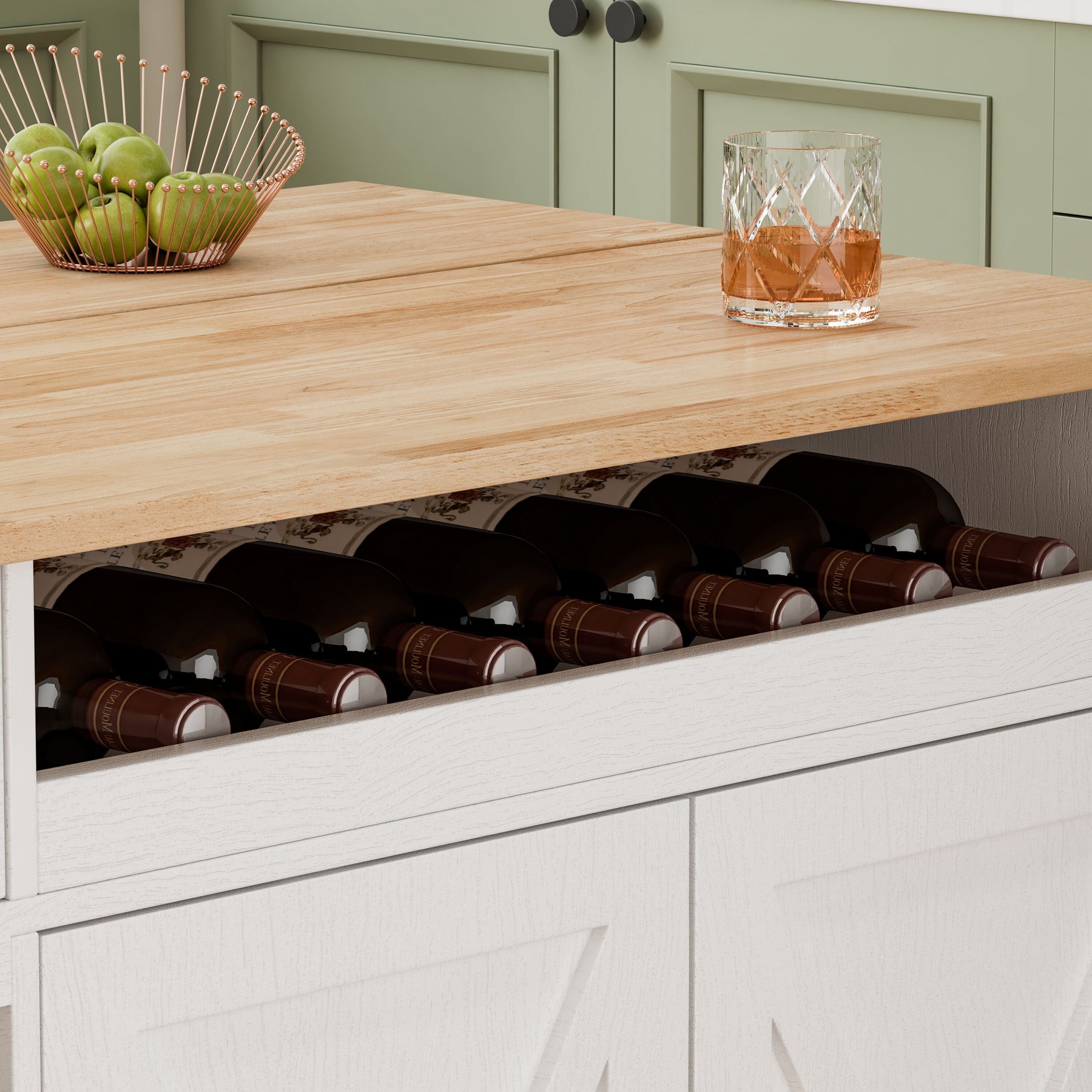 Maximize your kitchen or dining room space with the Damerin Rolling Kitchen Cart, featuring a sleek white MDF base and wooden top. This versatile mobile island offers adjustable shelves, a wine rack, and multiple storage options, making it an indispensable addition to any modern kitchen.