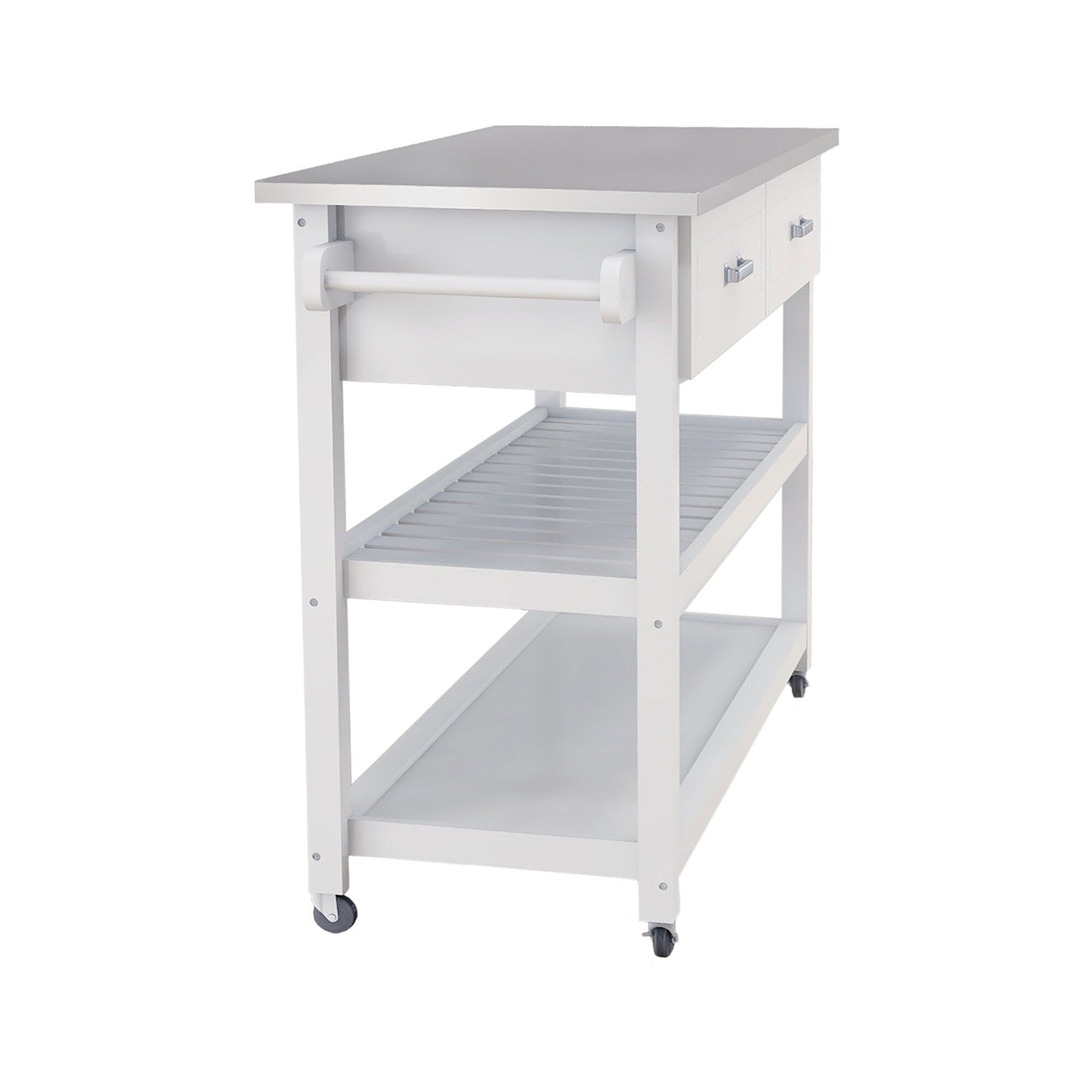 Elevate your culinary space with this exquisite kitchen cart, where elegance meets practicality. The striking contrast of the white wood base against sleek stainless steel details breathes a modern sophistication into any kitchen decor. Embrace its versatility by using it as a chic serving station or a mobile prep area, unlocking endless possibilities for stylish entertaining. With its graceful design and thoughtful functionality, this cart is the epitome of luxury fused with everyday convenience.