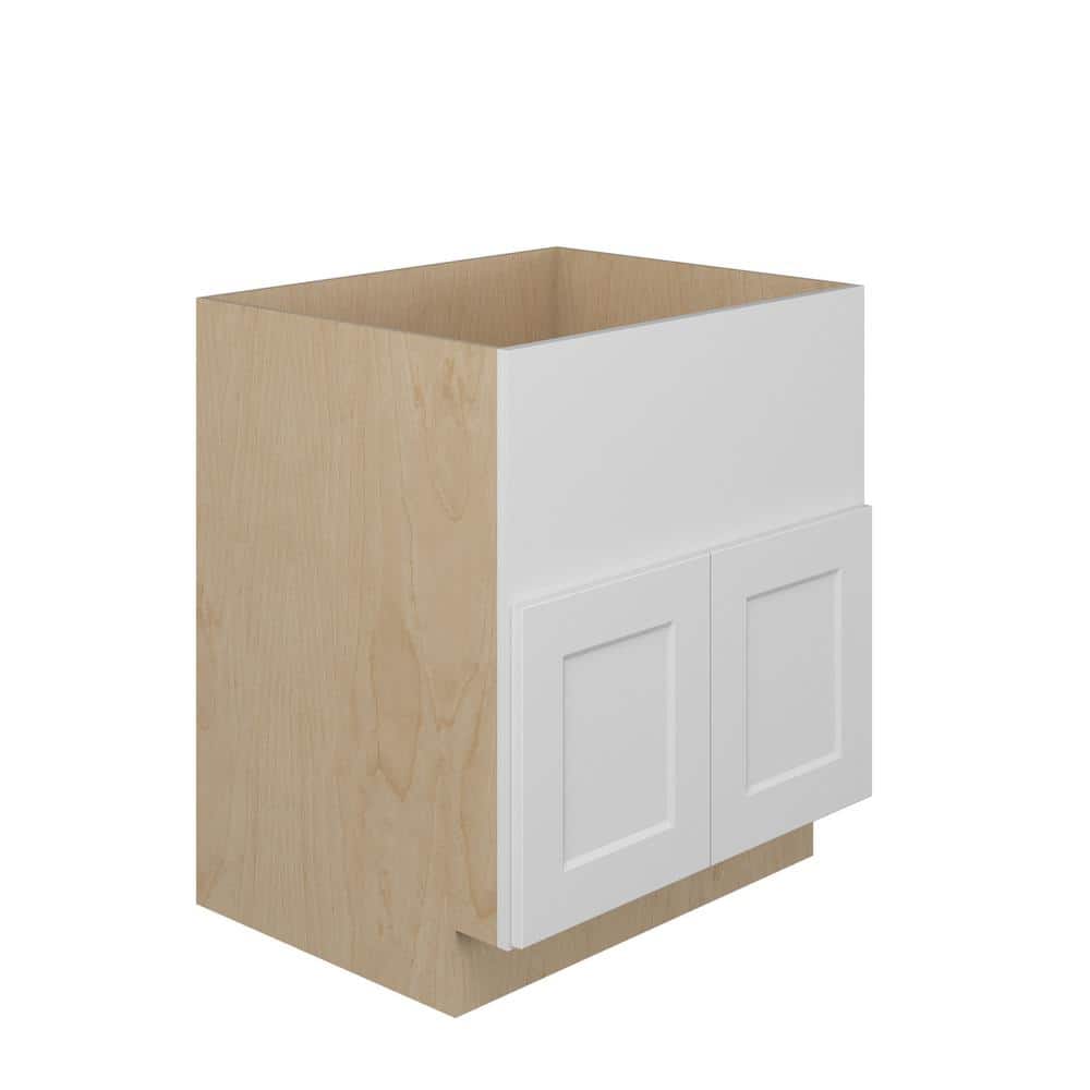 Transform your kitchen with the Norfolk Shaker 30-inch Farm Sink Base Cabinet in pristine painted white. Crafted from durable plywood and featuring solid birch face frames, this elegant cabinet combines traditional charm with modern functionality, making it an excellent fit for any kitchen style.