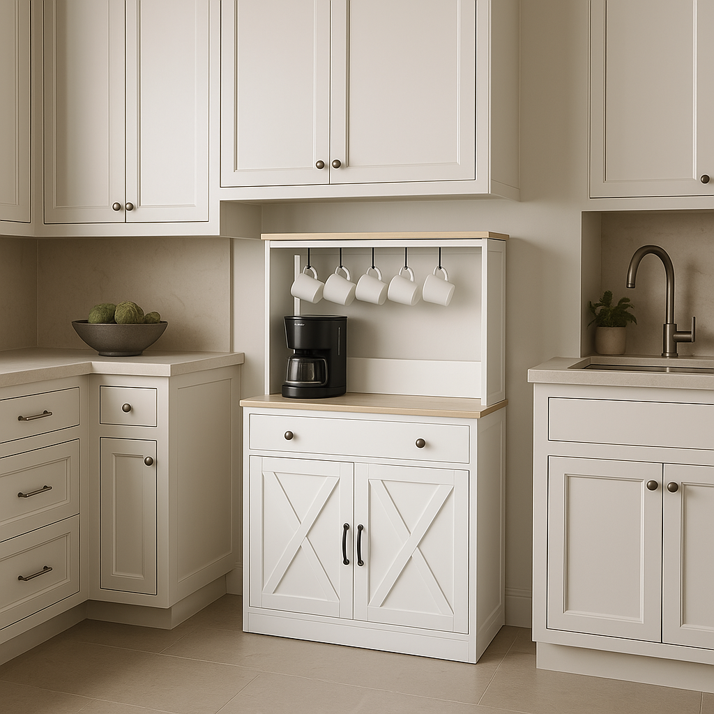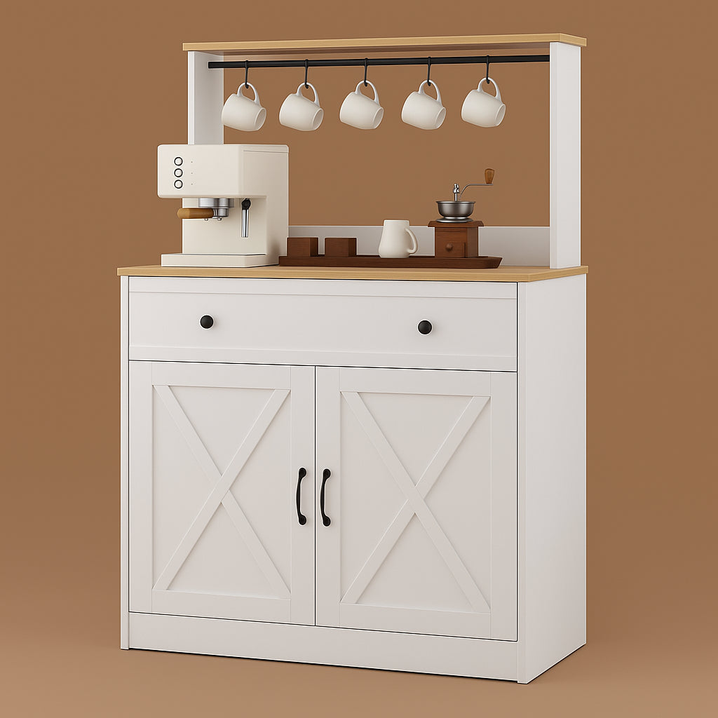 Puluomis White Kitchen Sideboard Pantry with Cup Holders and Storage