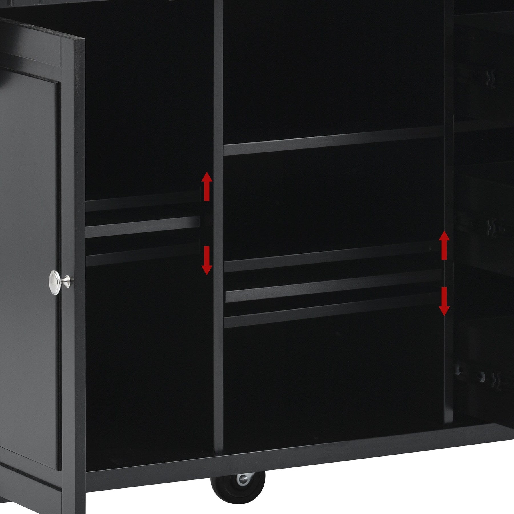 A: Yes, the island includes adjustable shelves that can be set at three different heights to accommodate various storage needs.