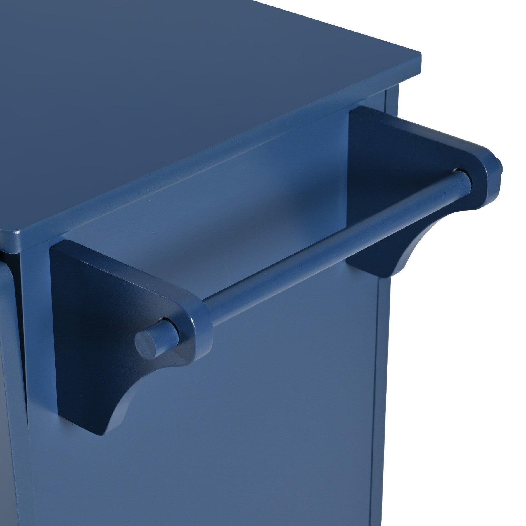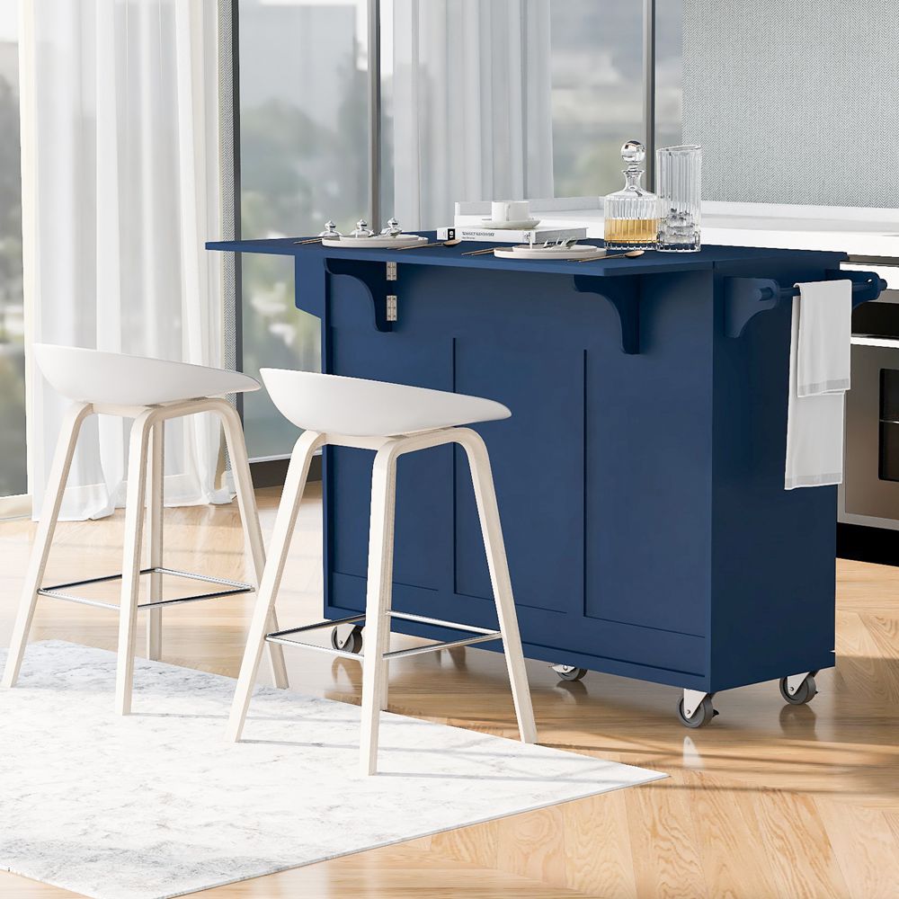 Transform your kitchen into a haven of efficiency and style with the Runesay Blue Rolling Kitchen Island. Evoking a touch of nautical elegance, its exquisite navy blue finish is bound to captivate the senses. The hidden handles present a minimalist aesthetic while maximizing practicality, and the drop-leaf adds flexibility to your culinary setup. Position it centrally or against a wall to achieve a functional flow that embodies luxury and utility, perfect for any home chef's dream space.