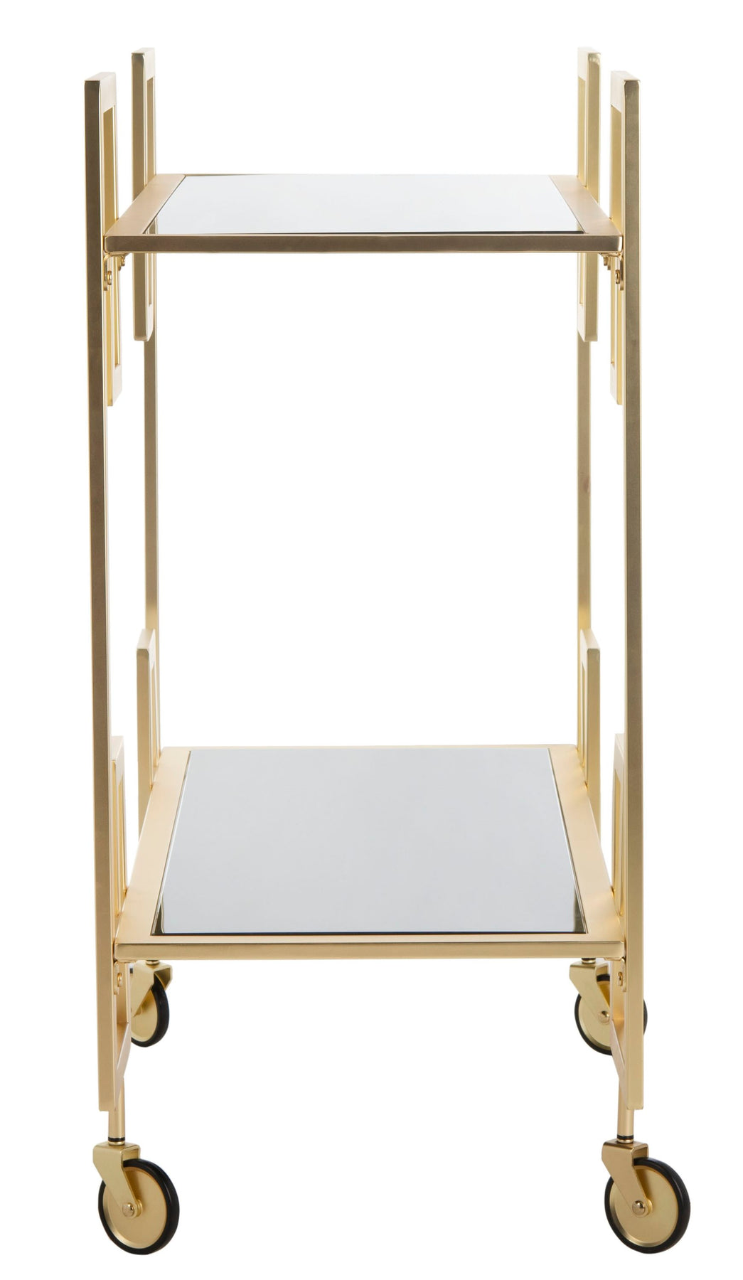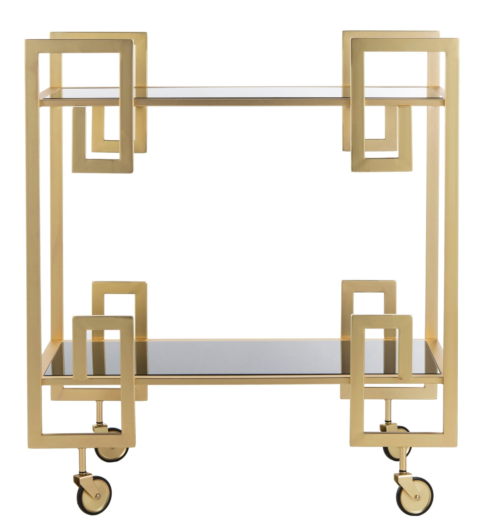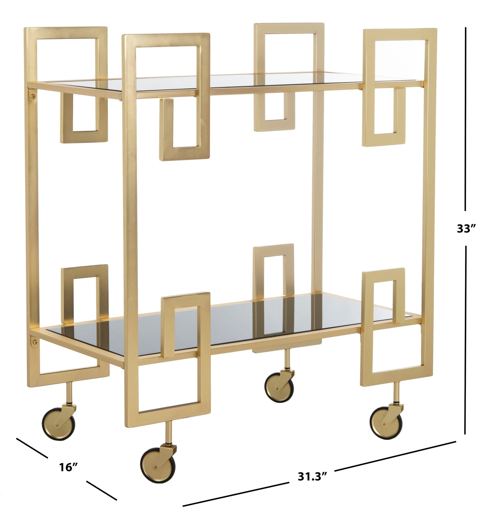 This Safavieh Eliza rolling cart pairs a luxe gold metal frame with chic black glass shelves for a striking, modern serving solution. Compact yet functional, its two-tier design and smooth casters make entertaining effortless in kitchens, dining rooms, or living spaces.