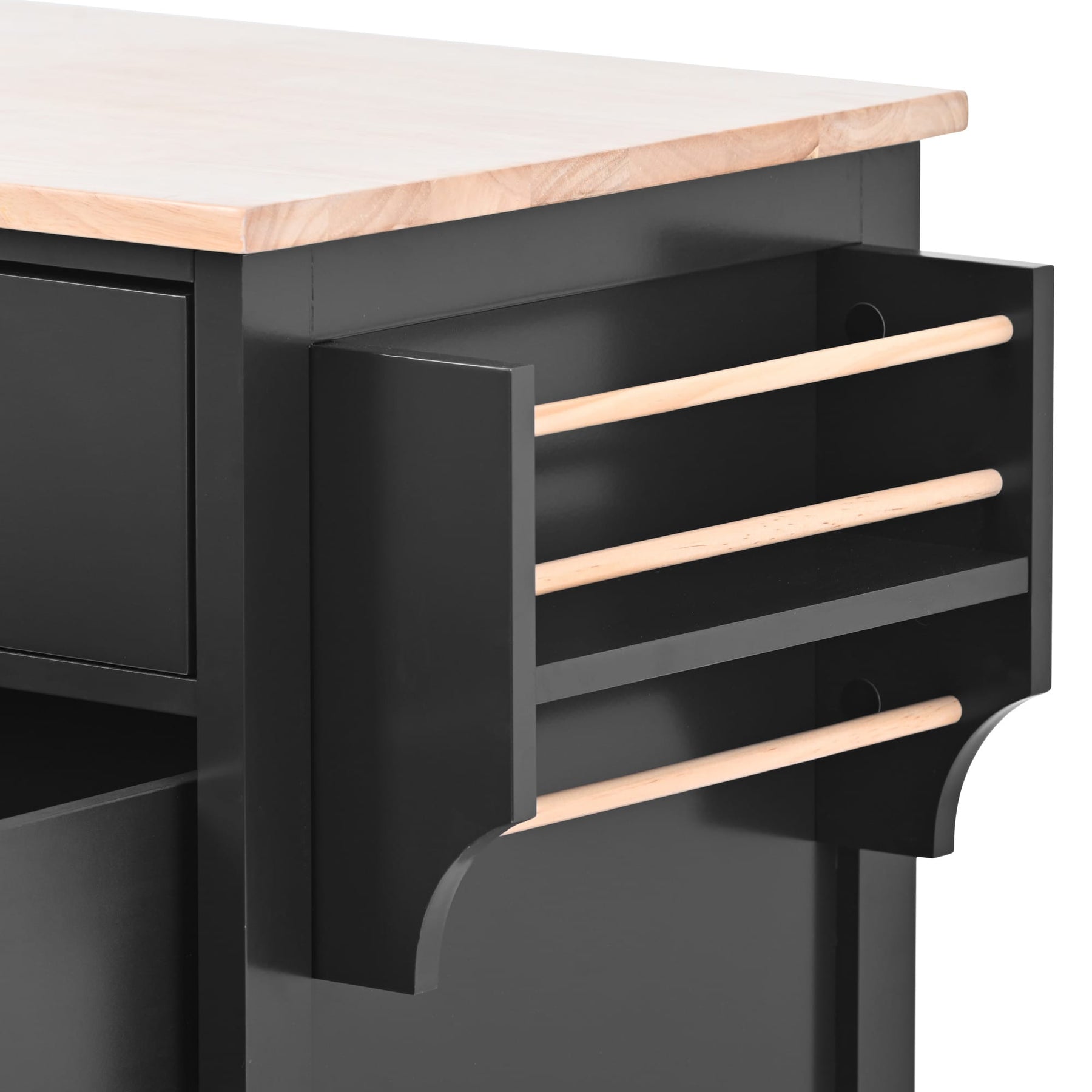 A: Yes, the cart is equipped with a spice rack and a towel bar for easy access.