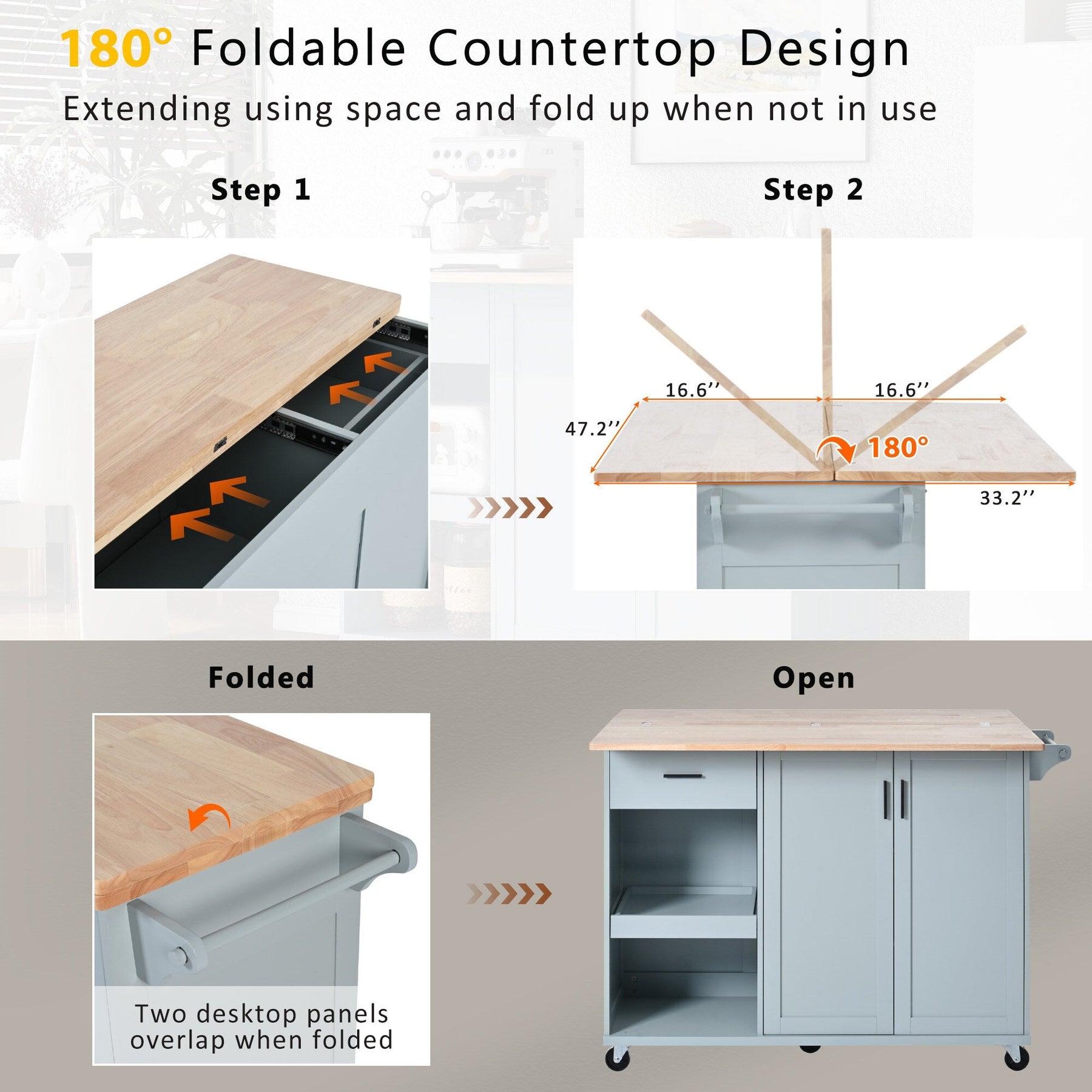 • Foldable Countertop: Use alone or in pairs to accommodate four people, optimizing space and versatility.