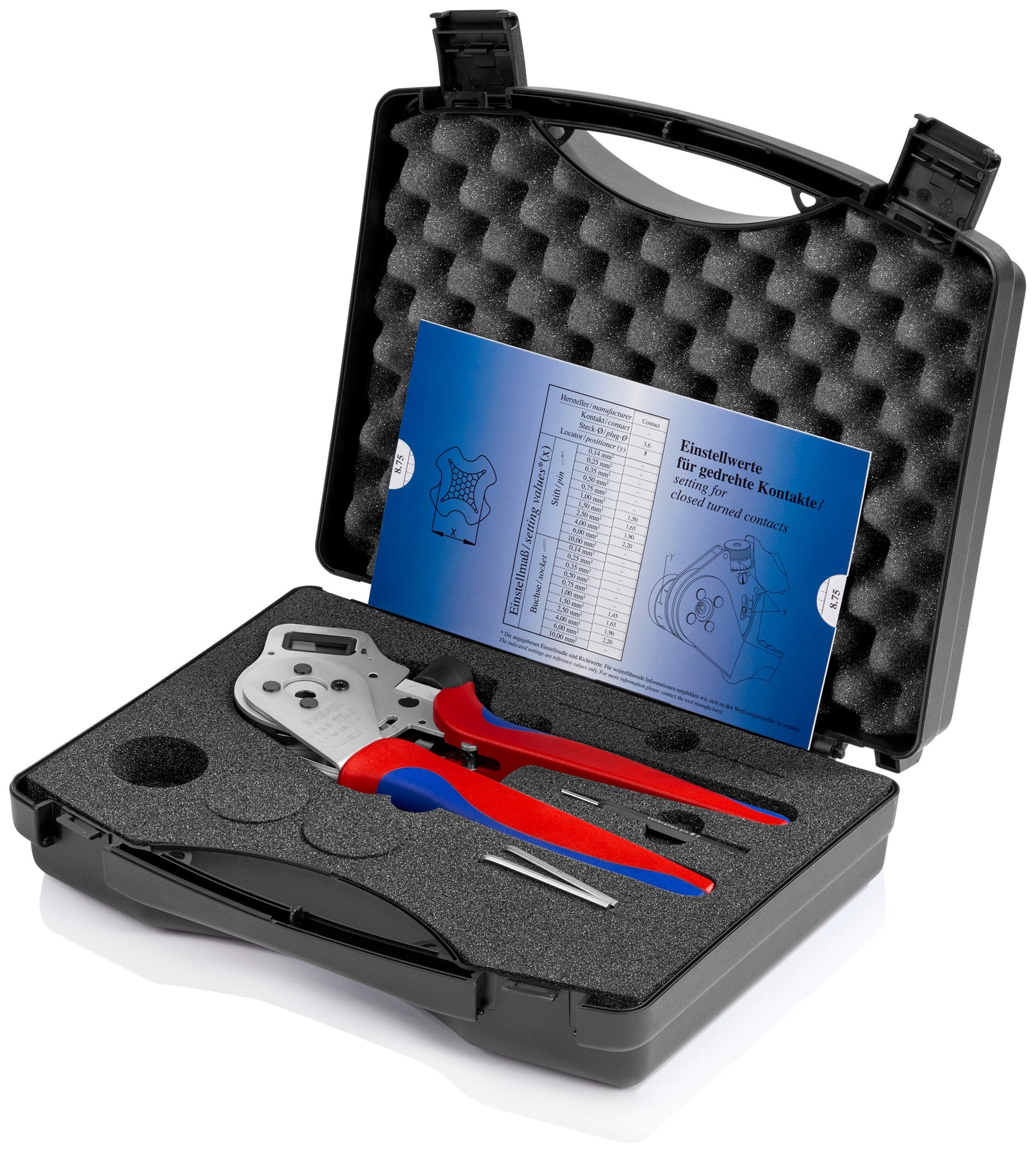 Professional-grade crimping pliers engineered for electrical work on turned contacts. The tool features a digital display for precise preset crimping capacities and a durable chrome vanadium steel build with comfort-grip handles.
