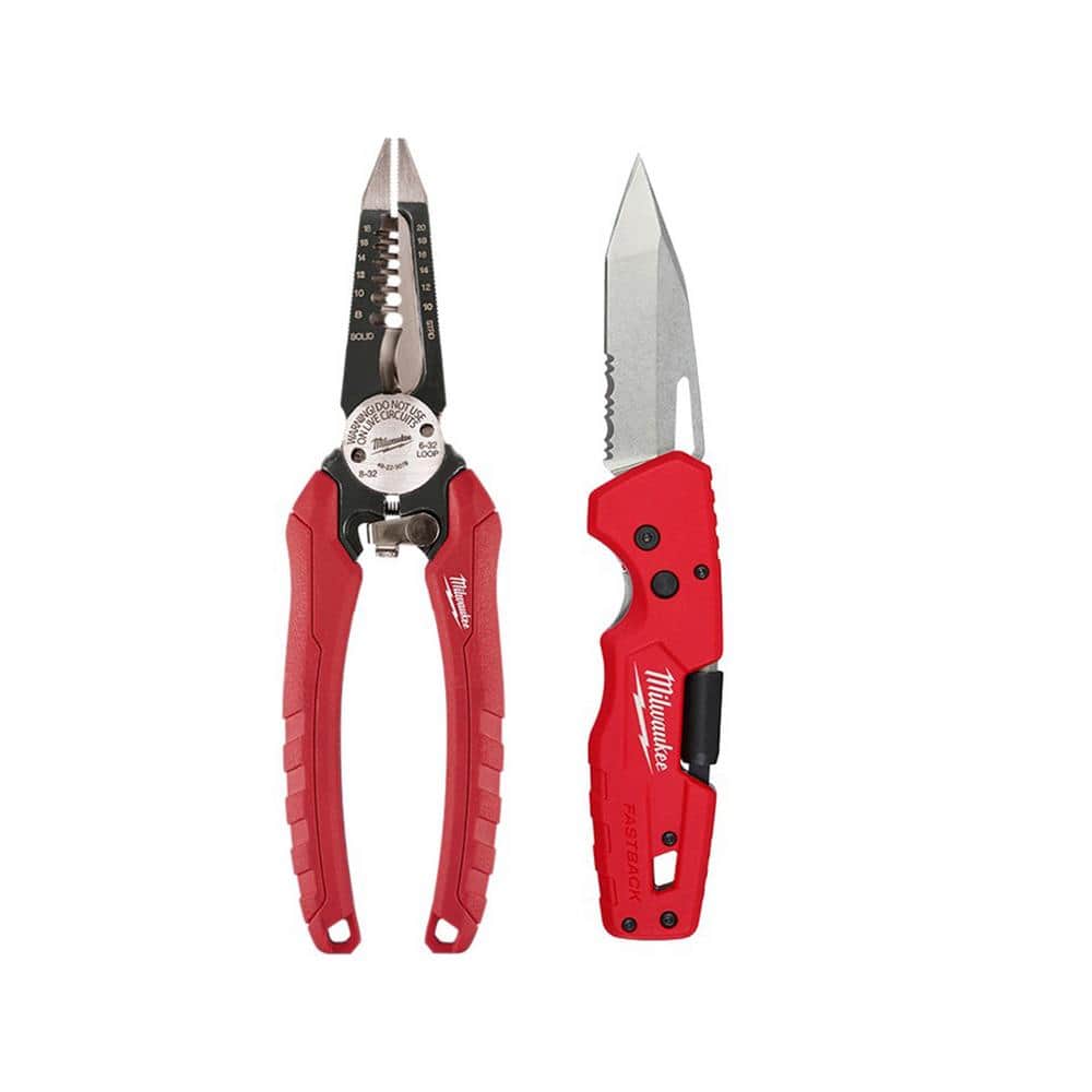 A durable, multi-functional cutting and wiring set for pros and DIYers. The Fastback folding knife features a stainless steel tanto blade with partial serration and one-handed press-and-flip opening, while the combination wire pliers handle stripping, cutting, bolt trimming, and reaming.