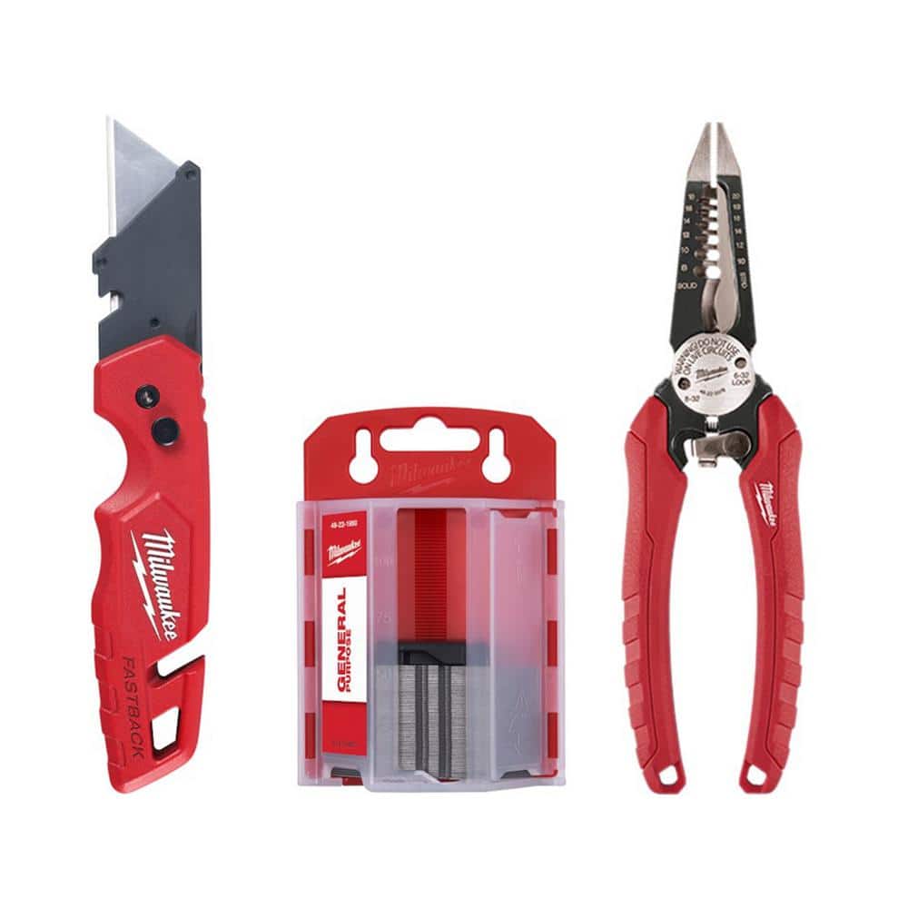 Boost jobsite efficiency with Milwaukee’s FASTBACK folding utility knife and 6‑in‑1 combination pliers. The knife features press-and-flip one-handed opening, tool-free blade changes, and onboard storage for five extra blades, while the forged pliers strip, cut, ream, and thread bolts with durable comfort grips.