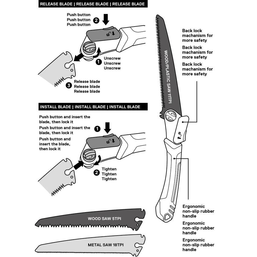 Quick blade change-no tools required Back lock mechanism for more safety Teflon coating for high durability 5T Double ground wood saw blade use for live wood 11T Triple ground wood saw blade use for wood and plastic 18T Milled metal saw blade use for non-ferrous metals (aluminum, copper) Bonus pouch