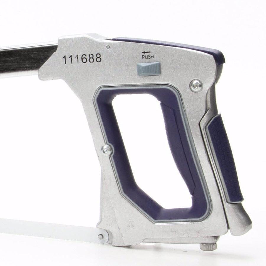Blade storage Easy tighten knob Cushioned grip Storage compartment holds extra blades Accepts 400 lbs. (30,000 psi) tension without damage Designed for use with bi-metal hacksaw blades