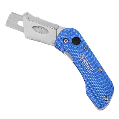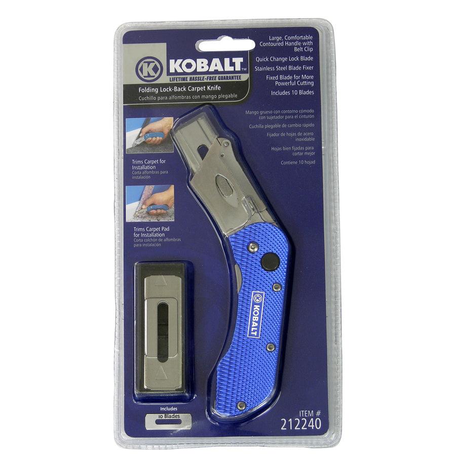 Large, comfortable contoured aluminum handle with belt clip Easy blade change design Fold knife for safe storage Includes 10 replacement carpet blades