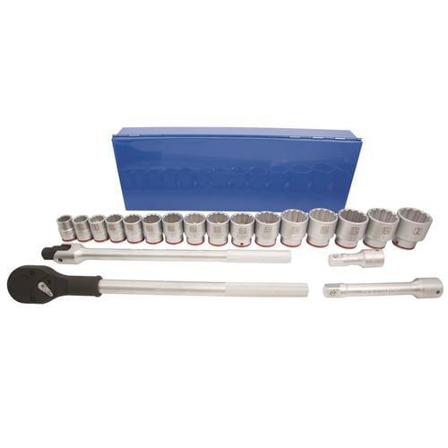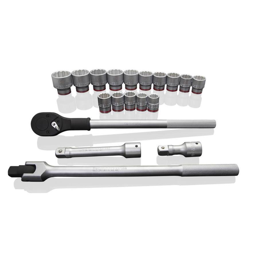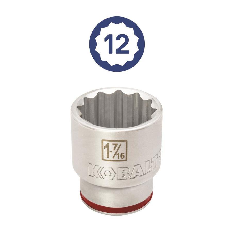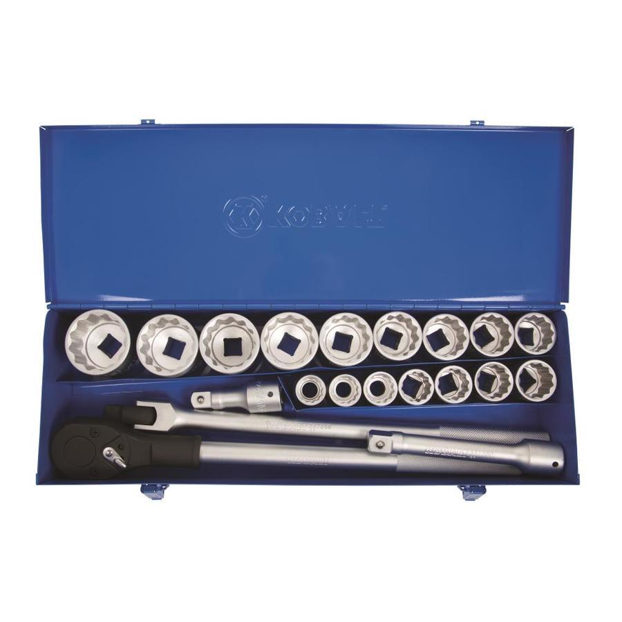 Durable, heavy-duty satin chrome vanadium steel construction is corrosion-resistant for long-term durability 3/4-inch drive sockets include 7/8, 15/16, 1, 1-1/16, 1-1/8, 1-3/16, 1-1/4, 1-5/16, 1-3/8, 1-7/16, 1-1/2, 1-5/8, 1-3/4, 1-13/16, 1-7/8 and 2-inch 24-tooth teardrop ratchet provides 15 ° of arc swing which is ideal for high torque/high leverage situations when working with agricultural and heavy equipment Quick-release button on ratchet makes accessory changes rapid and easy Knurled handle on ratchet and breaker bar improves grip for more comfortable use during high-torque applications Red color stripe helps to quickly identify SAE sockets Heavy-duty, 3/4-in drive ratchet and breaker bar each measure 19 inches long Heavy-duty powder-coated steel case helps to keep your tools clean and organized in your shop or vehicle Meets or exceeds ASME specifications and is covered by Kobalt's hassle-free lifetime guarantee