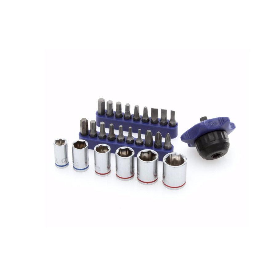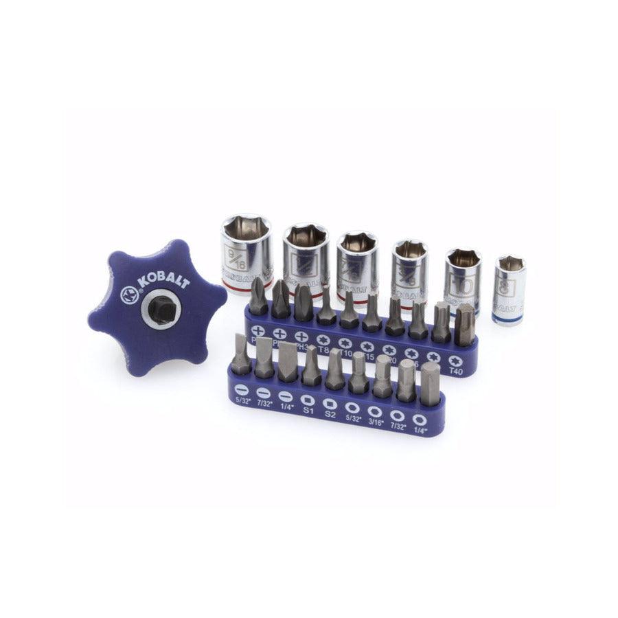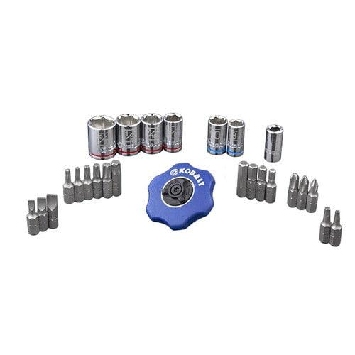 Kobalt 26-piece mechanic’s tool set includes 18 assorted insert bits, 7 sockets and 1 drive-palm ratchet Polished chrome vanadium steel construction is corrosion-resistant for long-term durability Quick-release adapter is compatible with any 1/4-in drive socket Reversing lever and ergo grip makes adjustments quick and effortless Shallow sockets can fit into tighter spaces to help you complete projects on car or motorcycle engines Insert bits easily snap into the ratchet for easy use Hassle-free lifetime guarantee gives you peace of mind Meets or exceeds ASME specifications Hassle-free lifetime guarantee