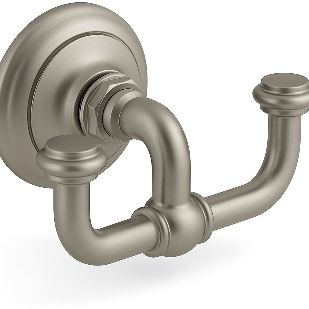 The KOHLER Artifacts Double Hook in Brushed Nickel offers a stylish and durable solution for hanging towels or robes. Made from premium brass, it features a corrosion-resistant finish and includes all necessary mounting hardware.