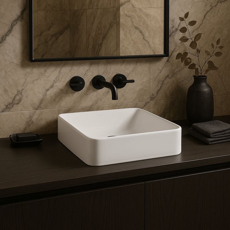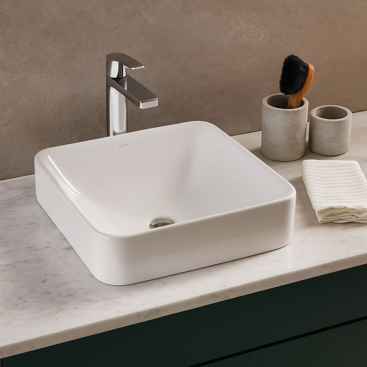 The KOHLER Vox Vessel Sink combines modern design with durable vitreous china construction. Its square shape and white finish make it a stylish addition to any bathroom.