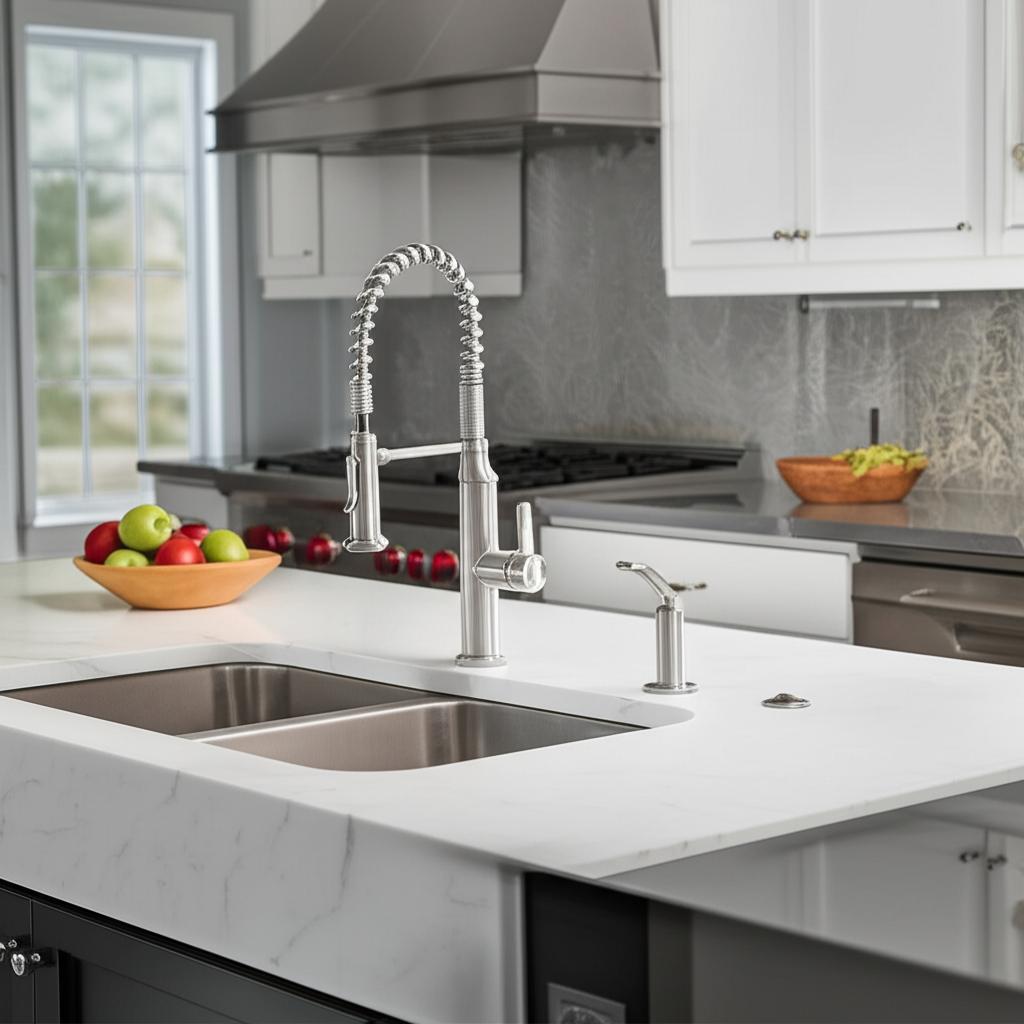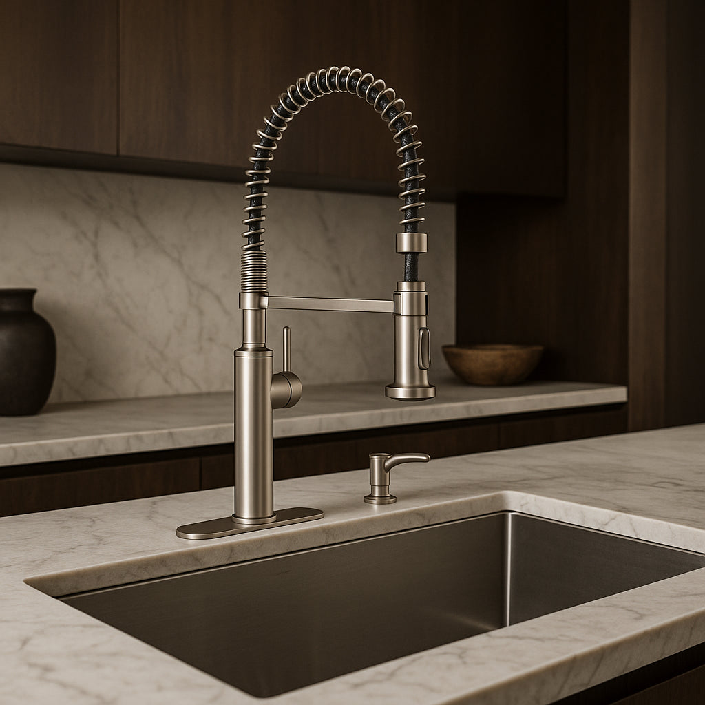 The KOHLER Sous Pro-Style Faucet is a masterpiece of industrial design, bringing a professional touch to your kitchen. Its exposed spring and sleek stainless finish create a bold statement, while the pull-down sprayer adds unmatched functionality. Pair it with a modern granite countertop to highlight its contemporary charm. This faucet is not just a fixture; it's a centerpiece for culinary creativity.