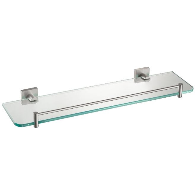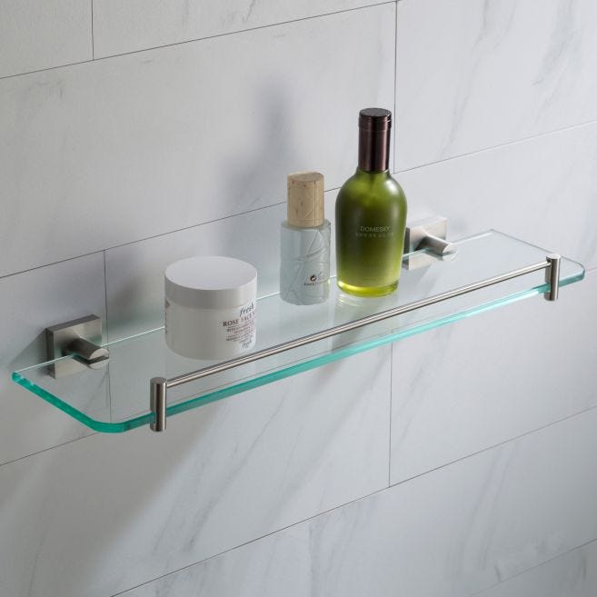 Streamline your bath storage with the KRAUS Aura shelf, featuring a tempered glass platform and a protective brushed nickel rail. Solid brass hardware provides lasting durability while the modern, concealed-screw design elevates any bathroom.