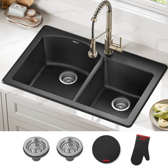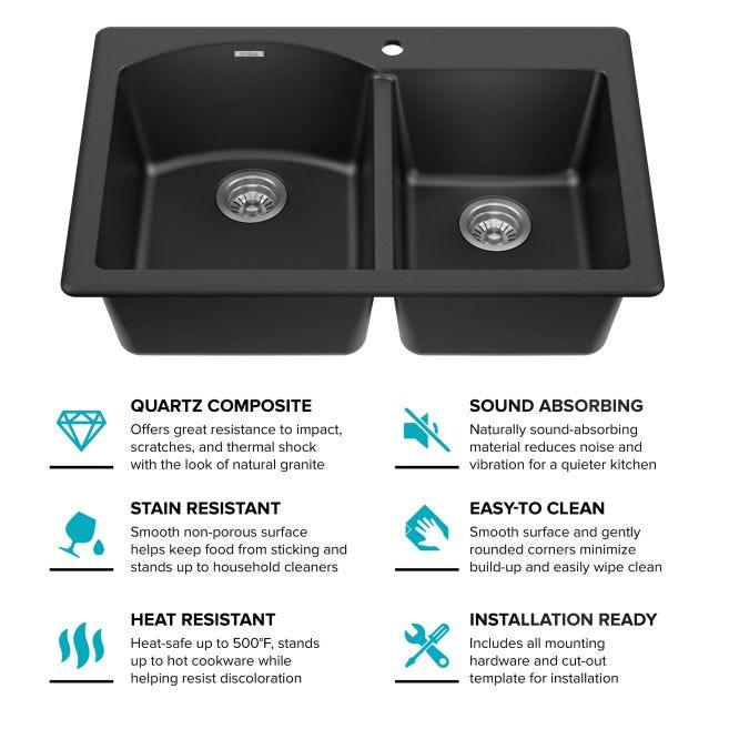 Built from advanced quartz composite, the KRAUS Forteza 33-inch double bowl sink combines the look of natural granite with outstanding durability. Its dual-mount design supports drop-in or undermount installation, with a thick beveled deck, 1 pre-drilled faucet hole, and accessories included for an easy setup.