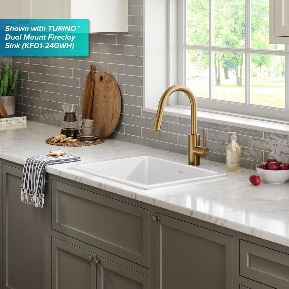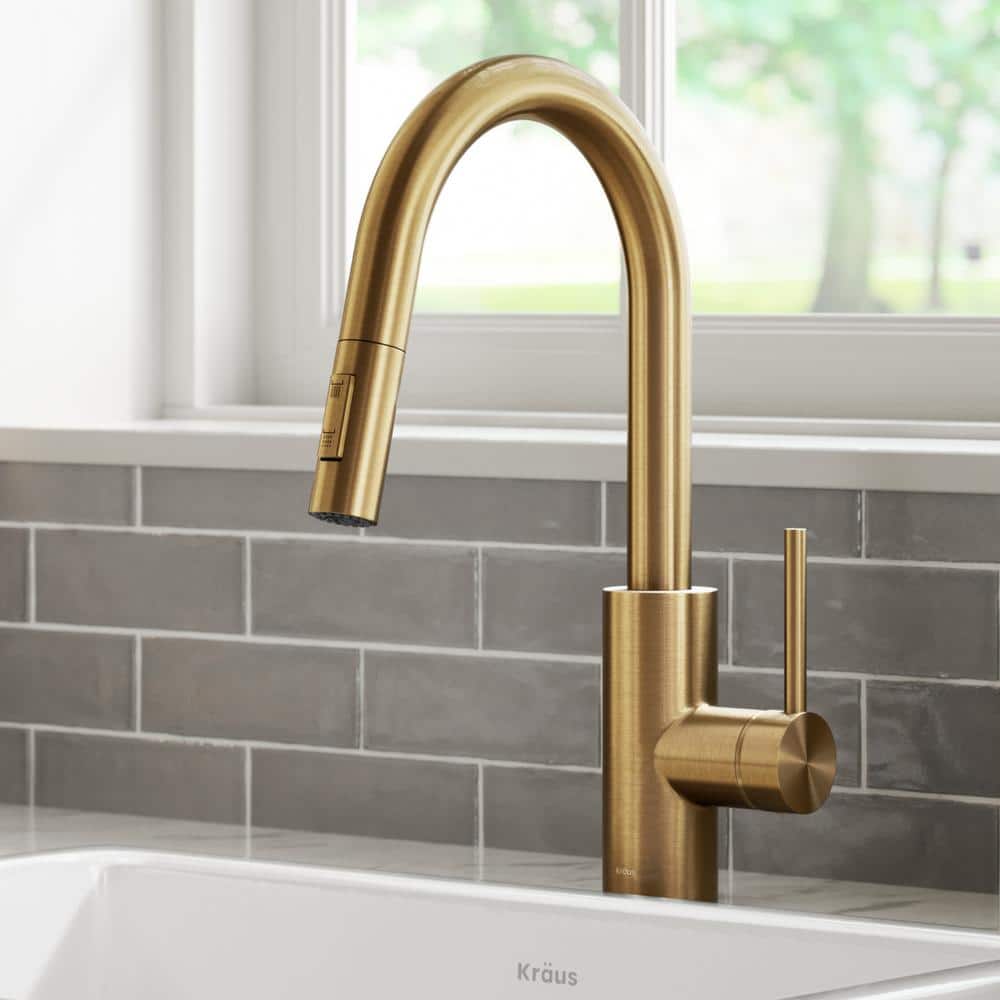 The KRAUS Oletto pull-down kitchen faucet delivers clean modern style and everyday performance. Its high-arc spout, dual-function spray, and spot-resistant brushed brass finish make cleanup easy while fitting under most cabinets with a 15-1/8 in. height.