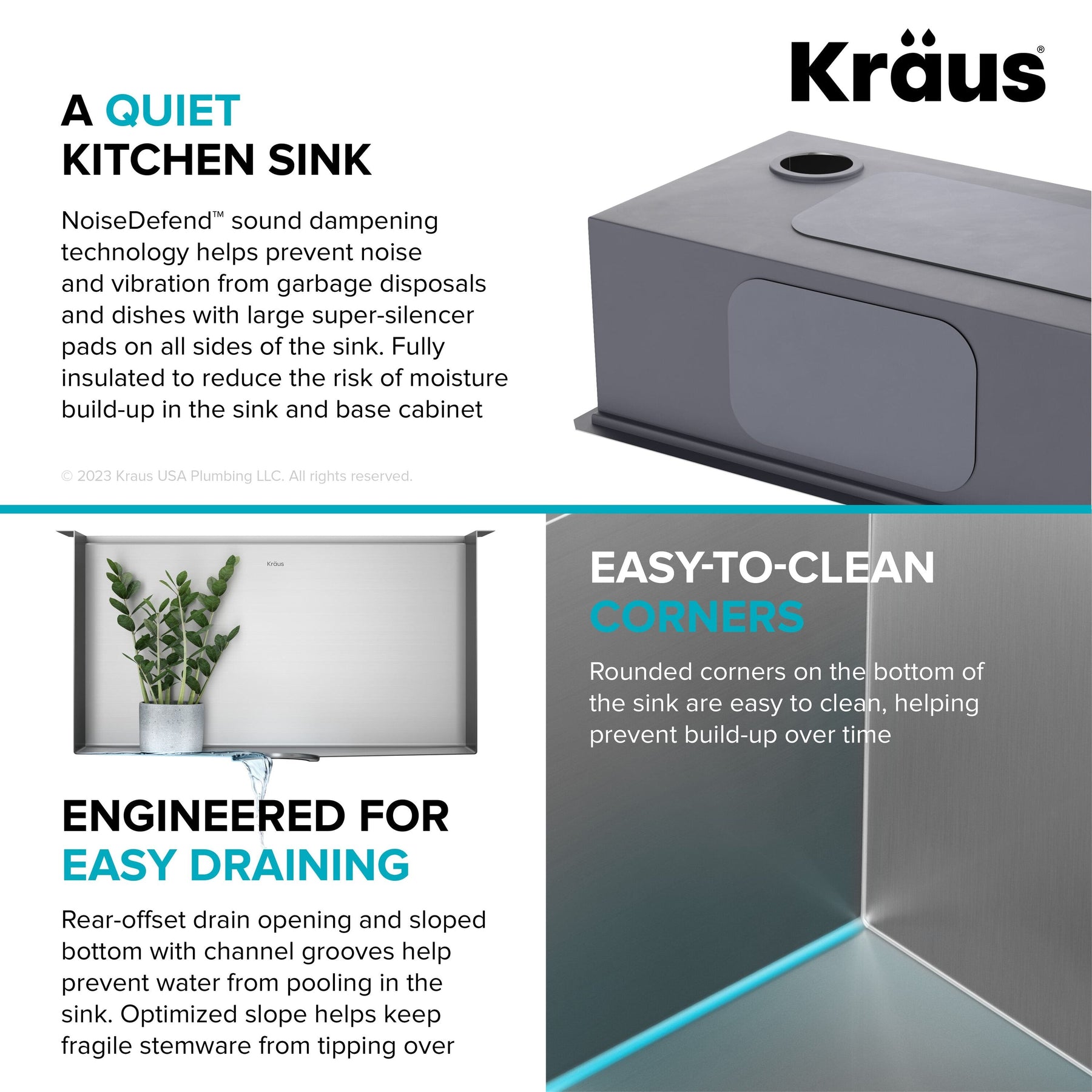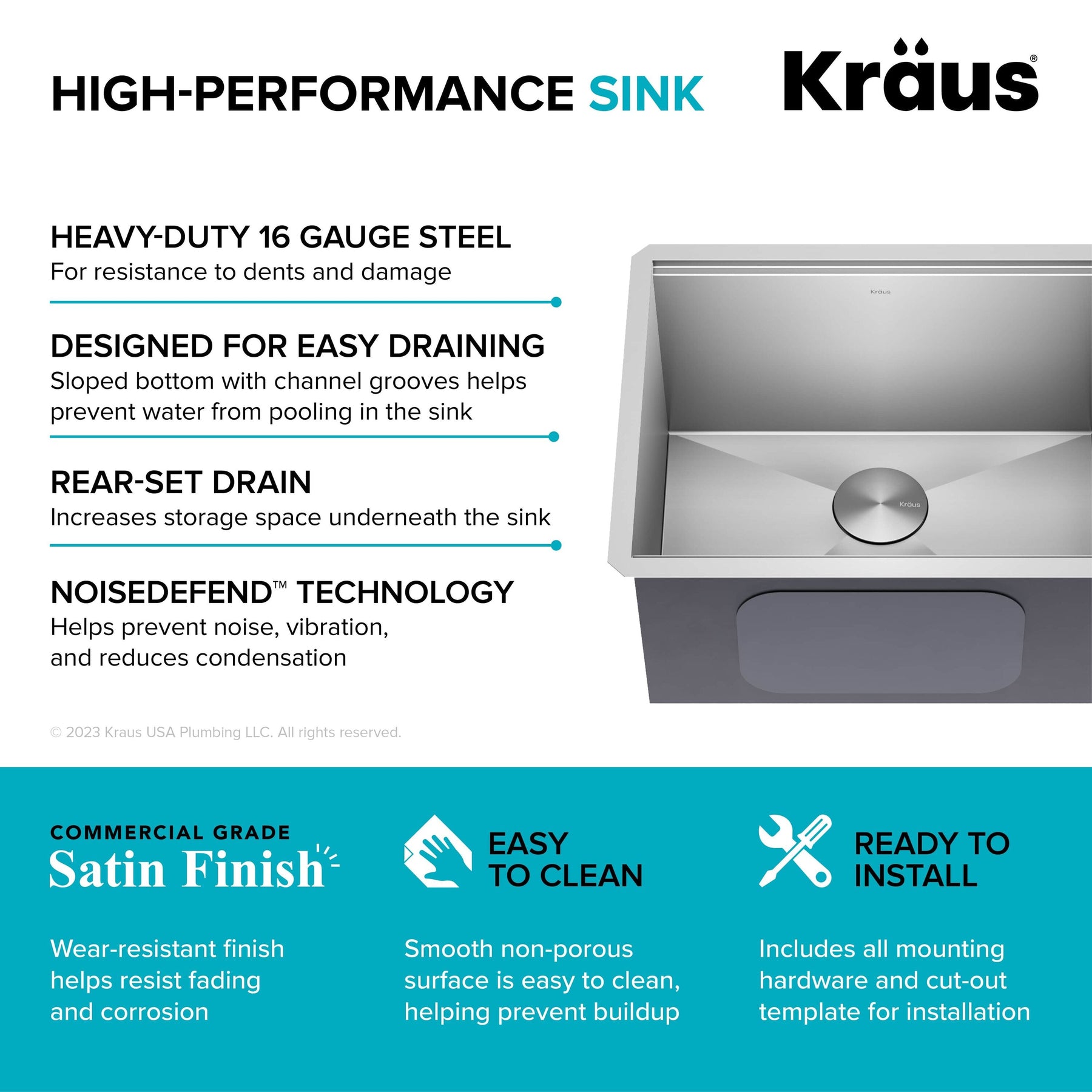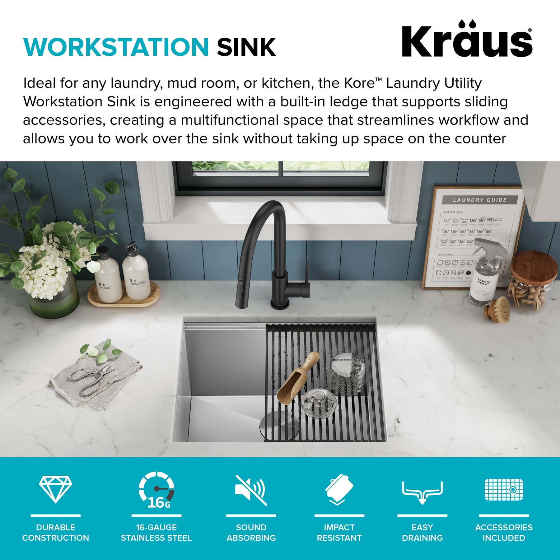 Redefine your workspace with the Kraus 19-in x 23-in Stainless Steel Undermount Laundry Sink. Engineered with a robust 16-gauge stainless steel build, it boasts lasting durability and minimal noise disruption thanks to NoiseDefend soundproofing. Featuring an integrated workstation ledge, it comes with convenient accessories to streamline your kitchen or laundry tasks.