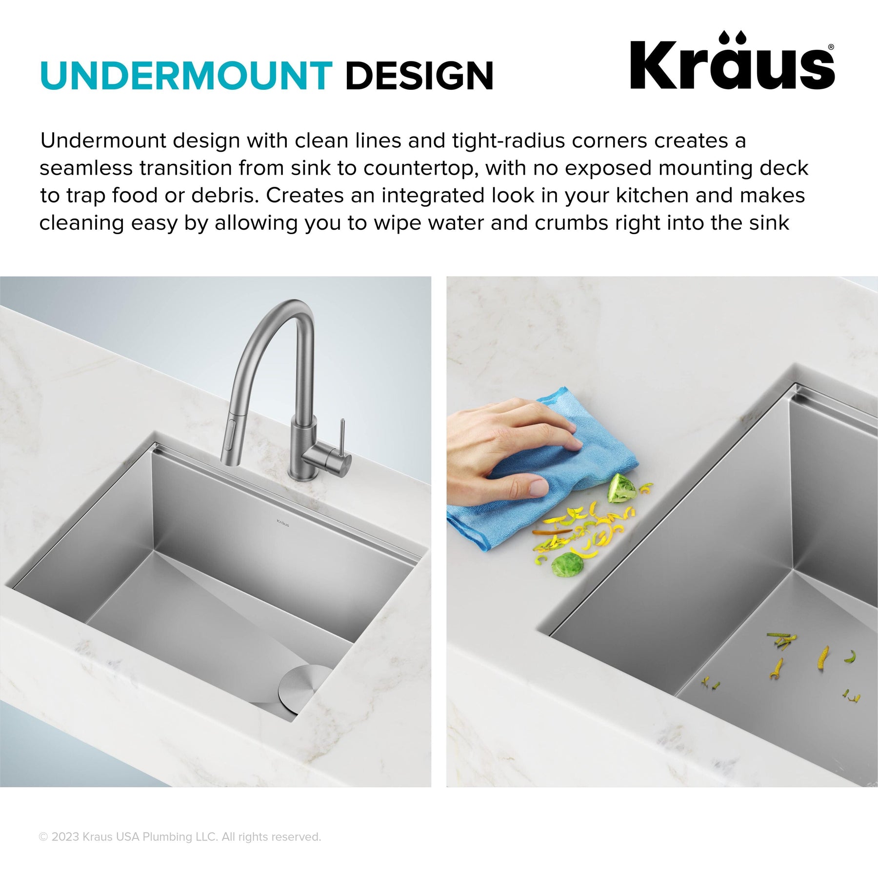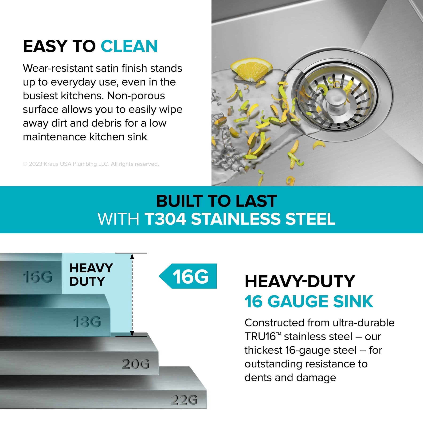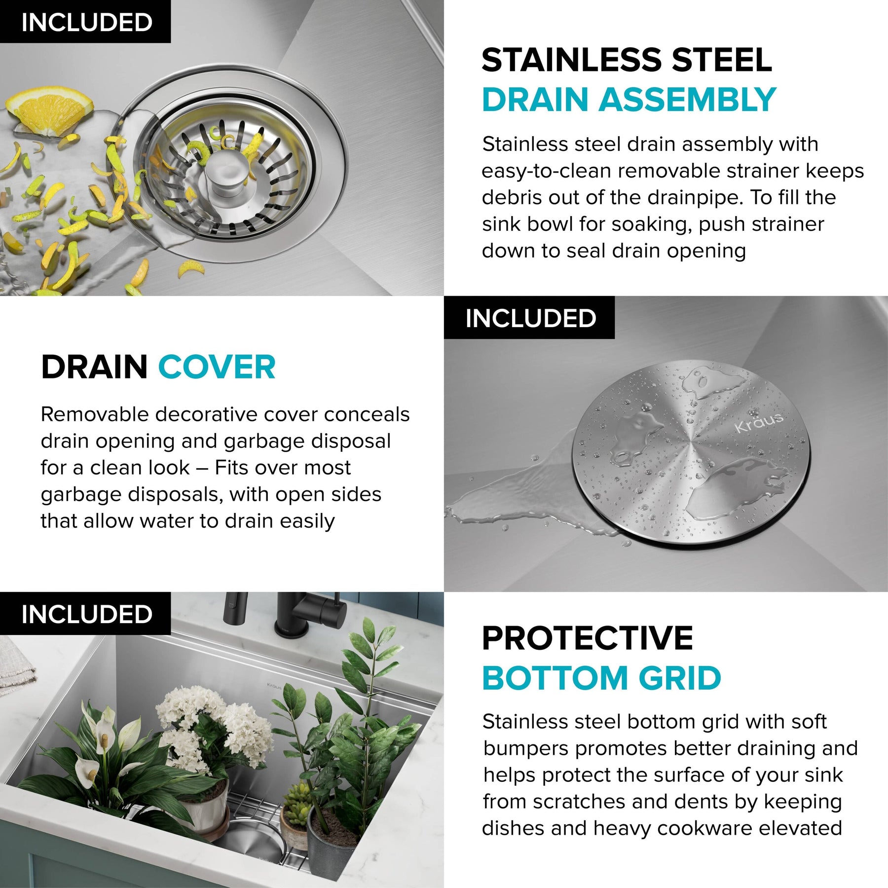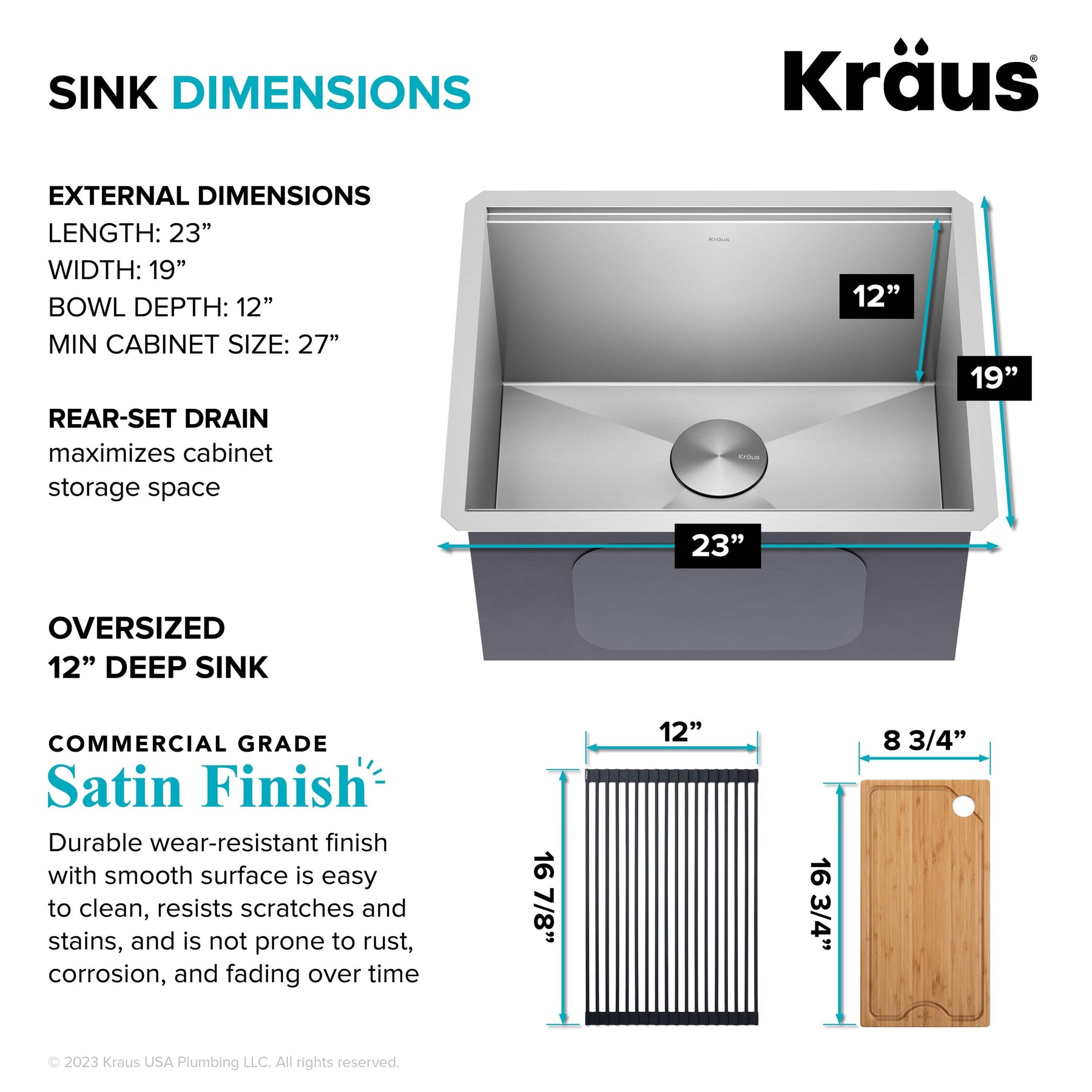 Redefine your workspace with the Kraus 19-in x 23-in Stainless Steel Undermount Laundry Sink. Engineered with a robust 16-gauge stainless steel build, it boasts lasting durability and minimal noise disruption thanks to NoiseDefend soundproofing. Featuring an integrated workstation ledge, it comes with convenient accessories to streamline your kitchen or laundry tasks.
