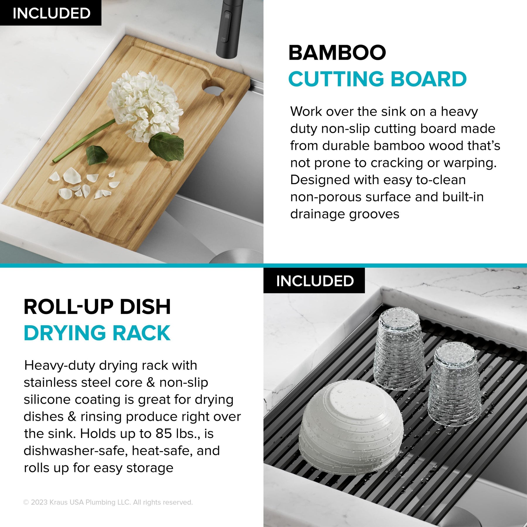 • Workstation Versatility: Comes with a bamboo cutting board and roll-up drying rack for multitasking efficiency.